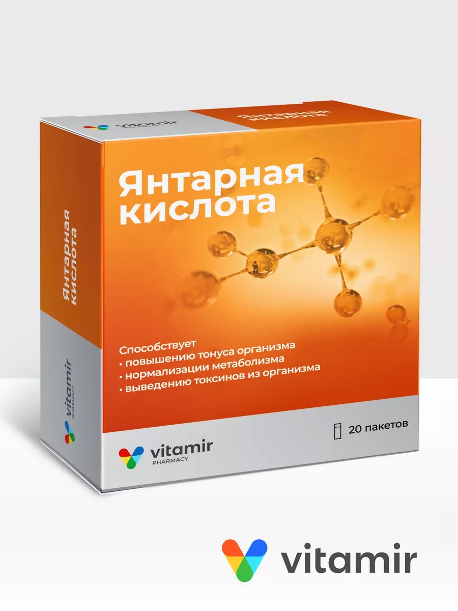 БАД Янтарная кислота ВИТАМИР стик - пакет №20. Янтарная кислота — необходимый компонент для поддержания активной жизнедеятельности организма. Однако воздействие внешних стрессовых факторов истощает запасы этого соединения в органах и тканях, что может приводить к повышенной усталости, снижению иммунитета и замедленному выведению токсических веществ. В частности, достаточное количество янтарной кислоты в организме за счет ее участия в обезвреживании ядовитого вещества ацетальдегида способствует уменьшению последствий алкогольного отравления.