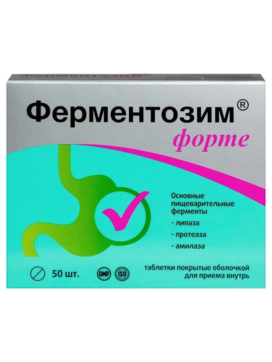 fermentozim forte n50 tablets of 170 mg. as a biologically active food supplement - a source of digestive enzymes, an additional source of biotin. pancreatin, microcrystalline cellulose, silicon dioxide, magnesium stearate, polyvinylpyrrolidone, biotin, shell. for sale to the population as a biologically active food supplement - a source of digestive enzymes, an additional source of biotin. (hereinafter according to the appendix). biologically active substances, in the tablets: biotin - 20-25 mcg, proteolytic activity - not less than 250 units, lipolytic activity - not less than 3300 units, amylolytic activity - not less than 4000 units. -