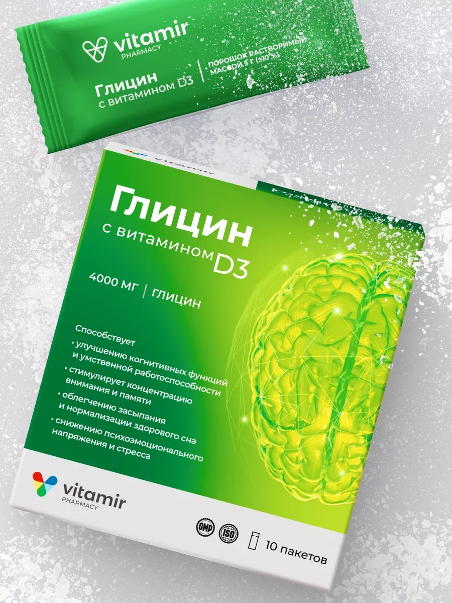БАД Глицин с витамином D3 для мозга и нервной системы стики 10 шт Vitamir.
