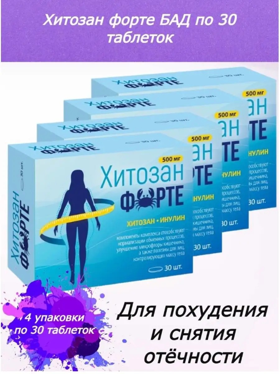 Хитозан Форте антиоксидант для похудения, коррекции фигуры и иммунитета таблетки №30 (VITAMIR).Хитозан - природное вещество, получаемое из панцирей ракообразных. Его используют в разных областях: науке, медицине, пищевой промышленности, и с каждым годом интерес к нему, его свойствам и пользе только растет. Обладает антиоксидантными свойствами, способствует нормализации функции иммунной системы. Хитозан от отеков и для похудения, как и пиколинат хрома. За счет своего химического строения хитозан способен связывать многие вещества, такие как ионы металлов, токсичные элементы, бактериальные токсины, образующиеся в процессе пищеварения в толстом кишечнике, и выводить их из организма, тем самым способствуя похудению. В экспериментах in vitro установлено, что в кишечнике хитозан способствует коррекции баланса микрофлоры. В пищеварительном тракте хитозан, действуя как магнит, способен связывать жиры до их усвоения и помогает им покинуть организм, препятствуя образованию жировых отложений. Снижение аппетита, витамины для похудения, детокс для похудения.Хитозан — природное вещество, получаемое из панцирей ракообразных. Является натуральным источником особой липофильной формы пищевых волокон. Его используют в разных областях: науке, медицине, пищевой промышленности, и с каждым годом интерес к нему, его свойствам и пользе только растет.Хитозан — это полисахарид, а точнее, вид нерастворимой клетчатки, «биофильтр», который не усваивается организмом. Обладает антиоксидантными свойствами, способствует нормализации функции иммунной системы. За счет своего химического строения хитозан способен связывать многие вещества, такие как ионы металлов, токсичные элементы, бактериальные токсины, образующиеся в процессе пищеварения в толстом кишечнике, и выводить их из организма. В экспериментах in vitro установлено, что в кишечнике хитозан способствует коррекции баланса микрофлоры. В пищеварительном тракте хитозан, действуя как магнит, способен связывать жиры до их усвоения и помогает им покинуть организм, препятствуя образованию жировых отложений. Также хитозан положительно влияет на сердечно-сосудистую систему, способствуя нормализации обмена холестерина в крови. Дополнительный прием хитозана может повышать адаптивные возможности организма при физической нагрузке. Инулин — растительный компонент, получаемый из корня цикория. Не переваривается в желудке и тонком кишечнике и достигает толстой кишки в неизмененном виде, где становится питательной средой для роста полезных бактерий, тем самым способствует развитию нормальной микрофлоры. Оказывает положительное влияние на метаболизм, способствует регуляции уровня сахара в крови. Попробуйте другие витамины для похудения, мультивитамины для женщин, витамины для иммунитета, витамины для мужчин, витамины для детей, биотин, для снижения аппетита, пиколинат хрома и другие бренда Витамир.Содержание в 1 таблетке: Хитозан - 500 мг (±10%), Сумма фруктозанов (инулин) - не менее 200 мг.Способ применения и дозы: взрослым по 1 таблетке 3 раза в день во время еды. Продолжительность приема — 1 месяц. При необходимости прием можно повторить.Противопоказания: индивидуальная непереносимость компонентов БАД, беременность, кормление грудью. Перед применением рекомендуется проконсультироваться с врачом.Состав: 