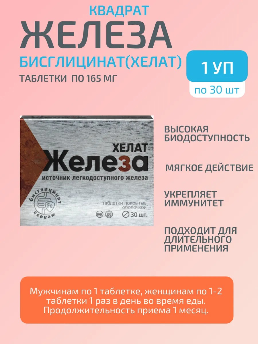 Витамир железа бисглицинат 30 шт. таблетки, покрытые оболочкой массой 165 мг – это биологически активная добавка к пище, которая содержит железо в органической форме, которое легко усваивается организмом и способствует поддержке его жизнедеятельности. Железо является микроэлементом, поступление которого необходимо для нормальной жизнедеятельности организма. Биологическая роль этого элемента очень многогранна.Железо принимает участие в окислительно-восстановительных реакциях, кроветворении, снабжении органов и тканей кислородом, активации и ингибировании (подавлении активности) целого ряда ферментов. Рекомендуется мужчинам по 1 таблетке, женщинам по 1-2 таблетки 1 раз в день во время еды. Перед применением рекомендуется проконсультироваться с врачом.
