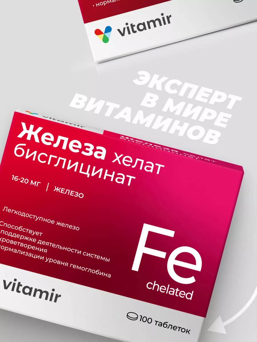 Furthermore, various metabolic processes in the body also involve iron, including cholesterol metabolism, the breakdown of peroxide compounds, and numerous vitamin transformations. Iron bisglycinate is an organic form of this trace mineral, which, due to its chemical structure, is better absorbed by the body than iron mineral salts. Try other vitamins for women, vitamins for men, heart vitamins, immune vitamins, and magnesium selenium from Vitamir. Contents per tablet (mg): Iron - 16-20. Dosage and administration: Men, 1 tablet; women, 1-2 tablets, once daily with meals. Duration of treatment: 1 month. Repeat treatment if necessary.