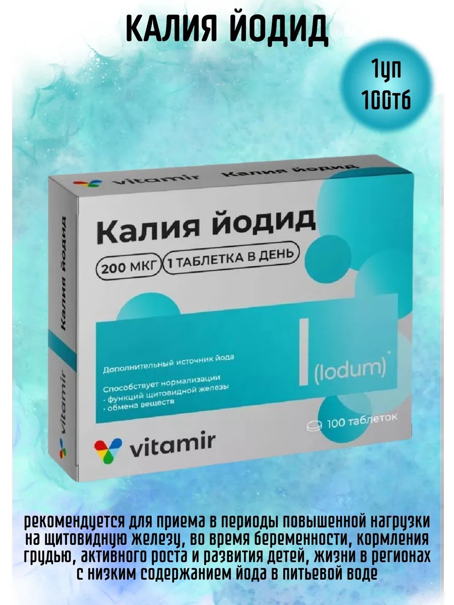 | Торговое наименование | биологически активная добавка к пище "Калия йодид 200 ВИТАМИР®" (таблетки массой 100 мг ± 10%) |