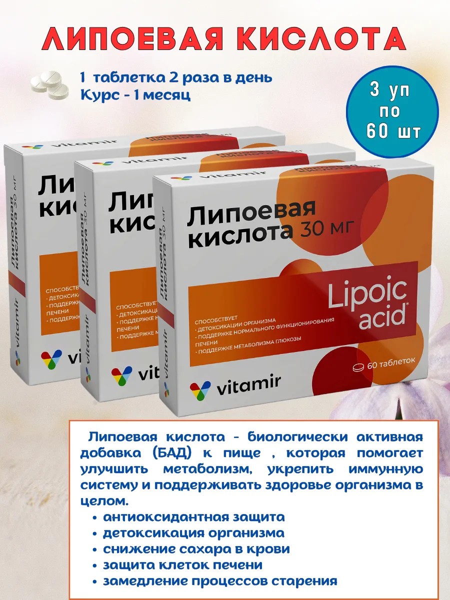 Lipoic acid (thioctic acid) is a dietary supplement that helps improve metabolism, strengthen the immune system, and maintain overall health. Available in tablet form for weight loss, it affects the areas of the brain responsible for appetite, reducing hunger, stimulates energy expenditure, and significantly improves glucose absorption by cells, lowering blood sugar levels. It protects the liver from the destructive effects of alcohol, as well as from toxins, heavy metals, and radionuclides. It detoxifies the body, lowers blood sugar, controls weight, and slows the aging process. It is used to normalize metabolism and liver function, and also as a general tonic, supporting health and beauty.