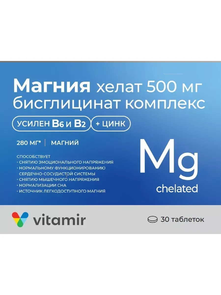ВИТАМИР Магния хелат 500мг с витаминами и цинком 30 таб 1400 мг -2уп
