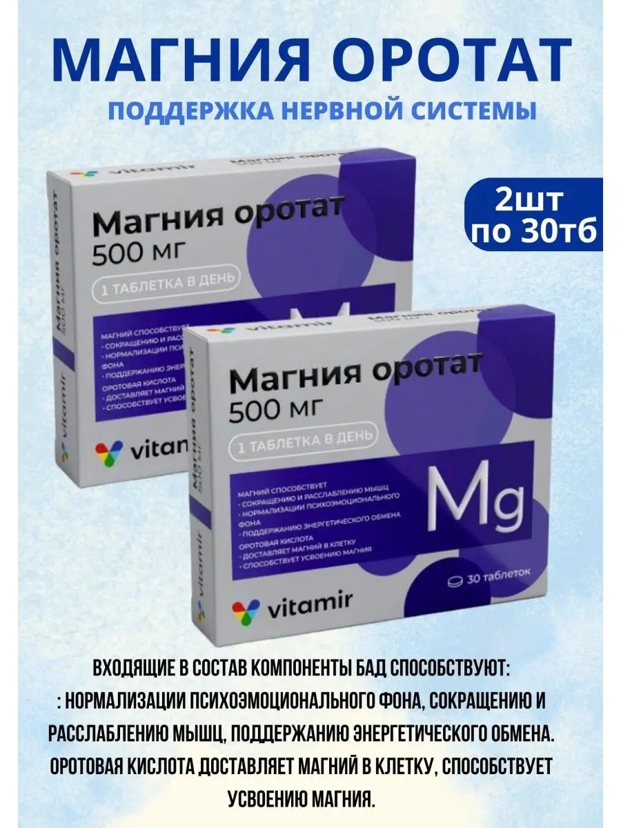 Магния оротат 500 мг Витамир - это биологически активная добавка к пище, разработанная для поддержки здоровья сердца и нервной системы. Каждая таблетка содержит 500 мг магния оротата, который является более усваиваемой формой магния. Принимая этот препарат, вы можете улучшить работу своего сердечно-сосудистой системы, снизить уровень стресса и тревожности, а также повысить уровень энергии и улучшить общее самочувствие. Препарат является безопасным и не имеет минимум побочных эффектов при соблюдении дозировки. В упаковке содержится 30 таблеток массой 650 мг каждая. Магния оротат - Биологически активная добавка (БАД) к пище