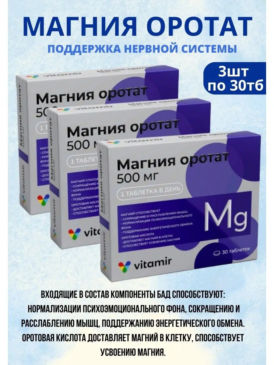 Магния оротат 500 мг Витамир - это биологически активная добавка к пище, разработанная для поддержки здоровья сердца и нервной системы. Каждая таблетка содержит 500 мг магния оротата, который является более усваиваемой формой магния. Принимая этот препарат, вы можете улучшить работу своего сердечно-сосудистой системы, снизить уровень стресса и тревожности, а также повысить уровень энергии и улучшить общее самочувствие. Препарат является безопасным и не имеет минимум побочных эффектов при соблюдении дозировки. В упаковке содержится 30 таблеток массой 650 мг каждая. Магния оротат - Биологически активная добавка (БАД) к пище