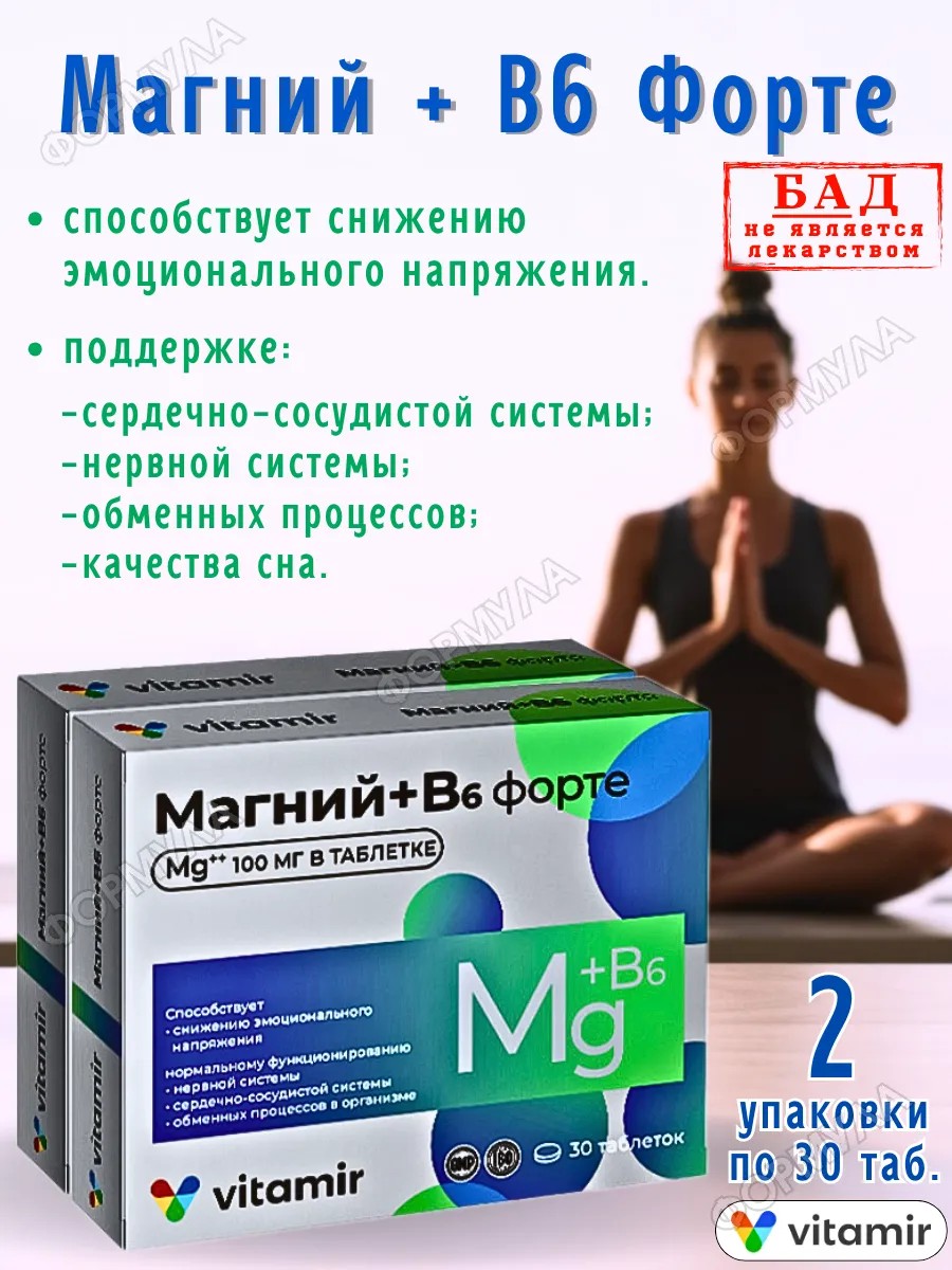 Магний + витамин В6 Форте для нервной системы 30таб*2уп