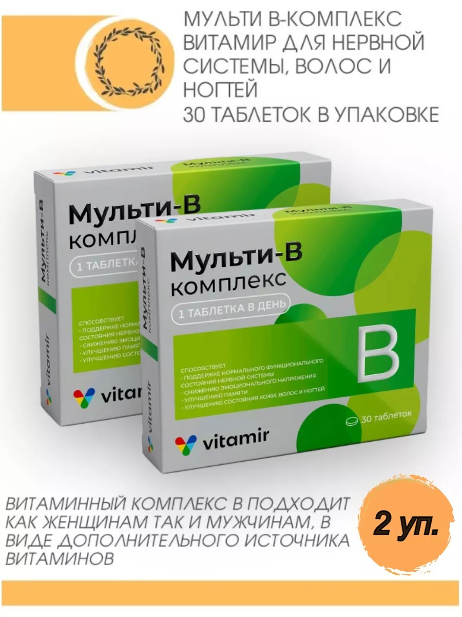 Мульти В-комплекс Витамир для нервной системы, волос и ногтей содержит в своем составе 11 витаминов группы В: витамины В1, В2, В3, В5, В6, В7, В12, инозит, парааминобензойноя кислота содержит холин. Мультивитамины В необходимы для нормального функционирования организма, обмена белков, углеводов и жиров и используются для лечения состояний и заболеваний, связанных с недостатком витаминов группы В и никотинамида. Витамины мульти В положительно влияет на состояние кожи, заменит крем для лица. Витаминный комплекс В подходит как женщинам так и мужчинам, в виде дополнительного источника витаминов. Прием витамина В избавит Вас от темных кругов под глазами, от тусклого цвета кожи, ломкости ногтей и выпадения волос, а также от появления морщин, после первой недели регулярного приема витаминов для укрепления волос, Вы заметите их блеск, ощутите прилив сил и энергии, с красотой придет и уверенность в себе и хорошее настроение. РЕКОМЕНДАЦИИ ПО ПРИМЕНЕНИЮ:взрослым по 1 таблетке 1 раз в день во время еды. Продолжительность приема - 1 месяц.