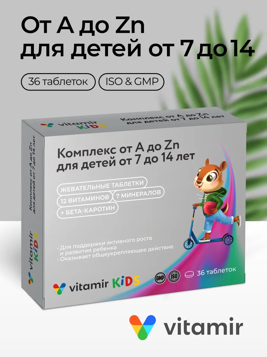 We present to you the chewable multivitamins "From A to Zinc" from Vitamir – the ideal solution for maintaining the health and strong immunity of children aged 7 to 14. These tasty and healthy tablets will be a real helper for parents concerned about the health of their children. Multivitamins "From A to Zinc" contain all the essential vitamins and minerals that are so important for a growing body. B vitamins, vitamins A, C, D3, E, K, as well as iron, zinc, calcium, magnesium, and other microelements – all in one tablet!