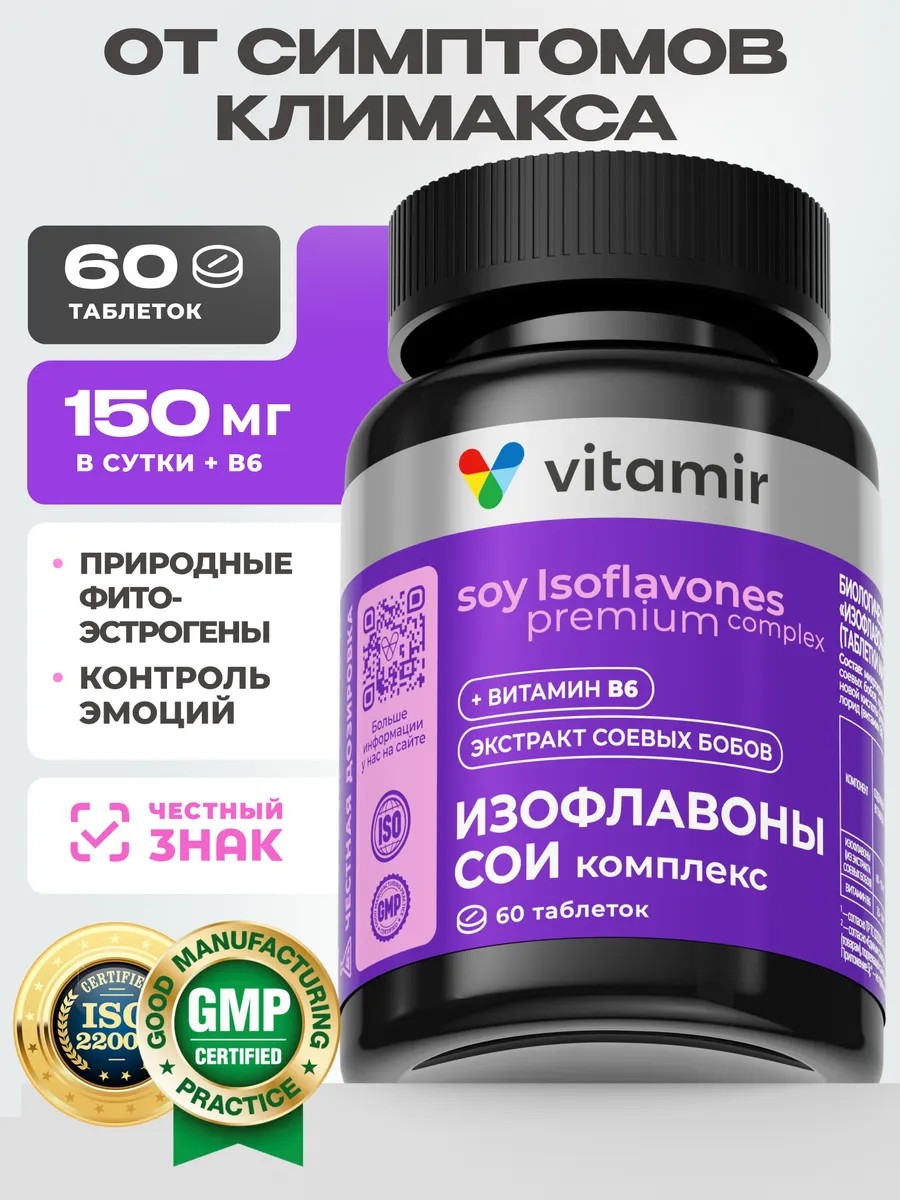 Enter a new stage of your life with confidence and harmony using the dietary supplement "Soy Isoflavone Complex" from VITAMIR PRO! This unique complex, containing soybean extract, will become your faithful assistant in the fight against unpleasant symptoms of menopause and hot flashes.