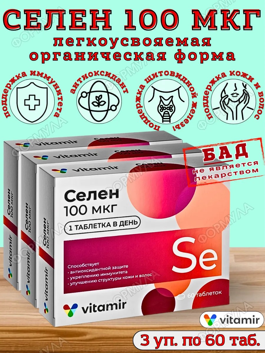 Селен 100 мкг Витамир, БАД с органическим селеном, антиоксидант, поддержка для сердца, сосудов, иммунитета, энергии, красоты кожи и волос, поддержания мужского и женского здоровья.