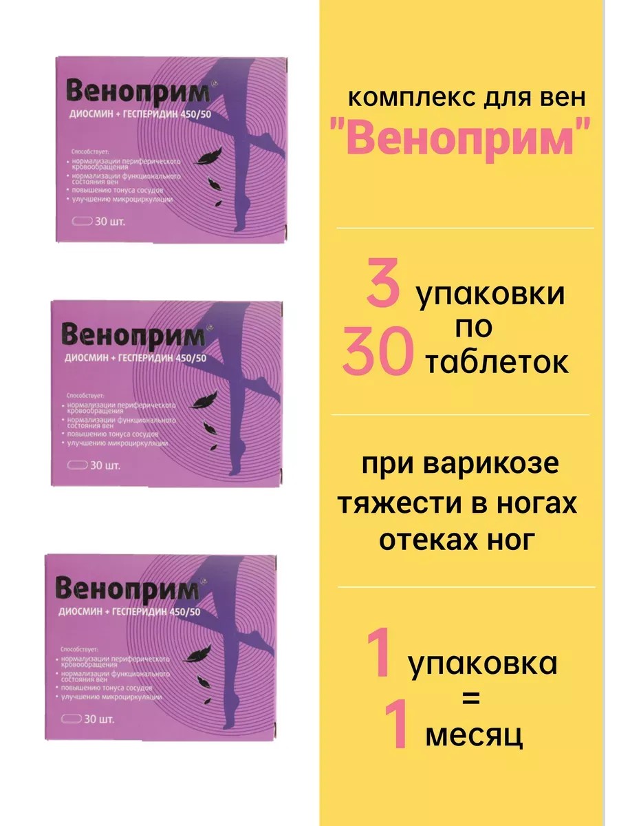 Веноприм – это биологически активная добавка к пище, созданная для поддержания красоты и здоровья ваших ног. Малоподвижный образ жизни, частые авиаперелеты, лишний вес, любовь к высоким каблукам и другие факторы могут вызывать неприятные ощущения в ногах, такие как отеки, усталость и тяжесть. Иногда это сопровождается еще и эстетическими дефектами — сосудистые звездочки, некрасиво выпирающие вены… «Веноприм» — это усиленный комплекс, который способствует нормализации функционального состояния вен, уменьшению степени выраженности отеков, оттока лимфы, повышению тонуса сосудов и уменьшению чувства тяжести в ногах, способствует облегчению симптомов геморроя.