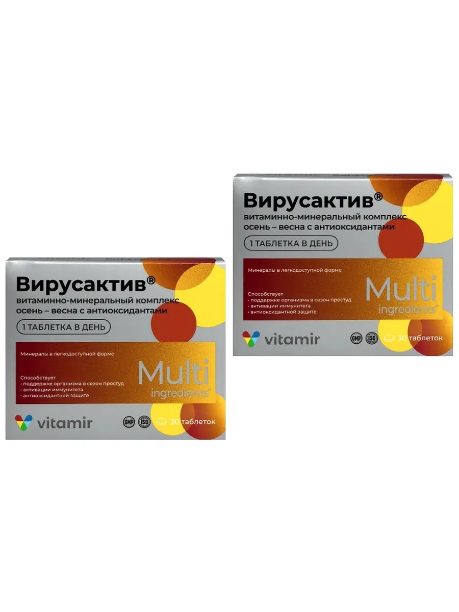 Вирус-Актив Витамир витаминно-минеральный комплекс осень-весна в таблетках БАД. в одной пачке 30 таблеток. :Антиоксиданты необходимо употреблять в профилактических целях в эпидемиологические периоды простудных заболеваний, чтобы оставаться здоровыми, а также при простудных заболеваниях и в период восстановления после них, для профилактики гиповитаминозов, которые ослабляют иммунную систему. Витамин С - участвует практически во всех процессах жизнедеятельности и при его дефиците организм человека полноценно существовать и развиваться не может, является ключевым компонентом в укреплении иммунитета. Витамин А - регулирует работу иммунной системы, является одним из эффективнейших витаминов для защиты органов зрения, а также кровеносной и сердечно-сосудистой систем. Витамин Е - нейтрализует свободные радикалы, являющиеся основной причиной старения. Витамин В6 - участвует в синтезе гормонов, а также нуклеиновых кислот, повышающих иммунитет и предотвращающих процессы старения. Необходим для образования красных кровяных телец. Витамин В9 - нужен для функционирования костного мозга, от нормальной работы которого зависит сила иммунитета. Отвечает за усвоение железа. Рутин - образует группу веществ, называемых флавоноидами, обладающих антиоксидантными свойствами. Снижает риск развития сердечно-сосудистых заболеваний. Цинк - способствует выработке Т-клеток, которые уничтожают бактерии и вирусы, помогает остановить развитие респираторных вирусных инфекций. Хром - повышает чувствительность к инсулину, способствует снижению уровня холестерина в крови, обеспечивает поддержание нормального физиологического уровня глюкозы в крови, является профилактическим средством сердечно-сосудистых заболеваний и сахарного диабета, способствует росту и регенерации тканей. Селен - повышает сопротивляемость организма к вирусам и бактериям, нейтрализует токсины и свободные радикалы, усиливает антиоксиданты - витамины Е, С. Стимулирует синтез гемоглобина. Янтарная кислота - увеличивает скорость распада токсических веществ, оказывает антиоксидантное и антигипоксическое действие. Железо - стимулирует кроветворение, повышает иммунитет, синтезирует гормоны щитовидной железы, ограждает от воздействия бактерий, стабилизирует окислительно-восстановительные процессыОсобые условияПеред применением рекомендуется проконсультироваться с врачом.ПоказанияРекомендуется в качестве биологически активной добавки к пище - дополнительного источника витаминов А, С, Е, В6, фолиевой кислоты, янтарной кислоты, рутина, железа, цинка, хрома и селена.Применение:1 таблетка один раз в день. Курс - 1-2 месяца. Перед применением необходимо проконсультироваться с врачом.