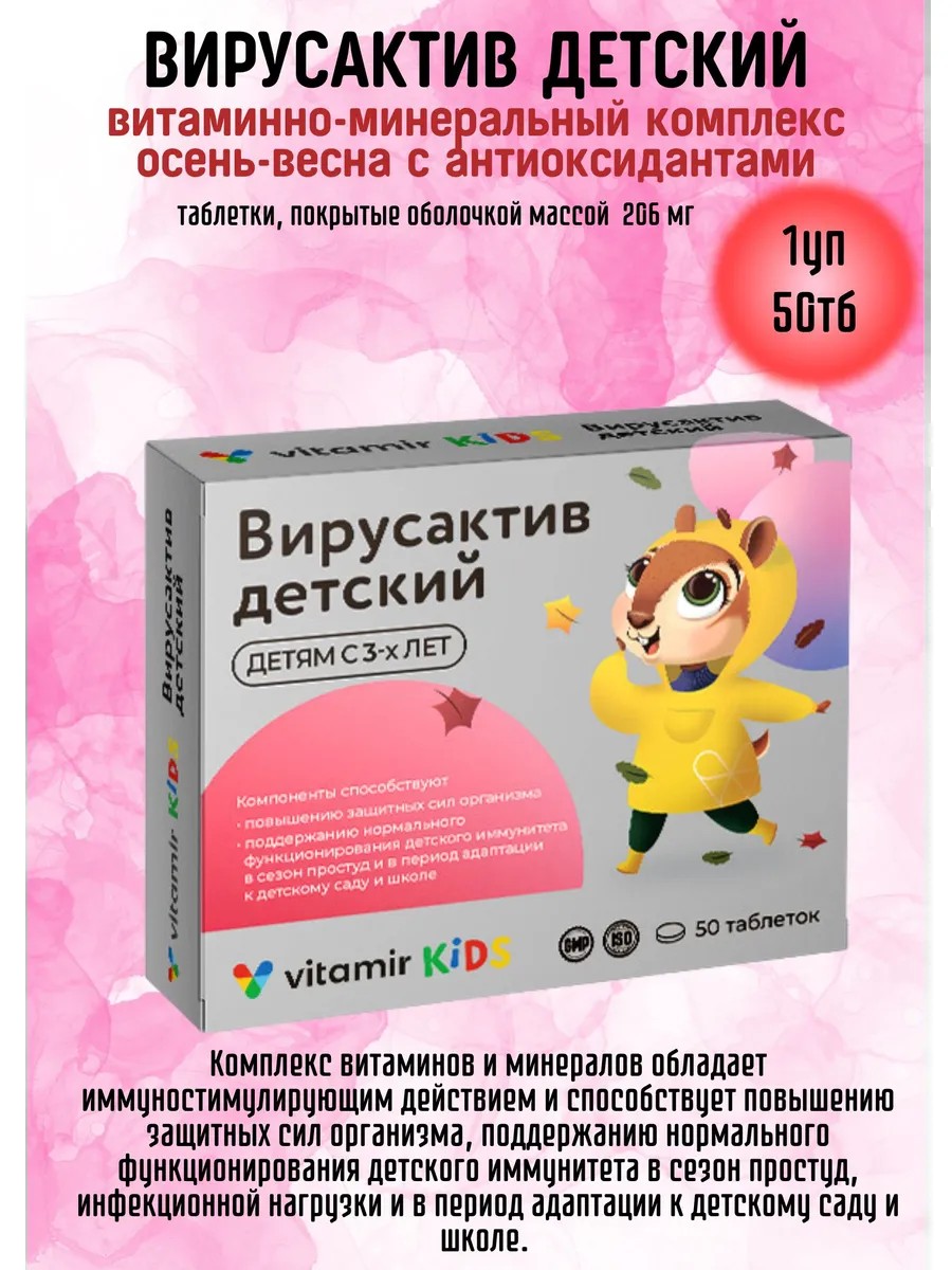 Витамир вирусактив-детский витаминно-минеральный комплекс осень-весна предназначен для поддержания здоровья детей в периоды осенне-весеннего обострения заболеваний. Применяется в качестве биологически активной добавки к пище - дополнительного источника витаминов: А, С, Е, В6, фолиевой кислоты и микроэлементов: железа, цинка. Комплекс витаминов и минералов обладает иммуностимулирующим действием и способствует повышению защитных сил организма, поддержанию нормального функционирования детского иммунитета в сезон простуд, инфекционной нагрузки и в период адаптации к детскому саду и школе.