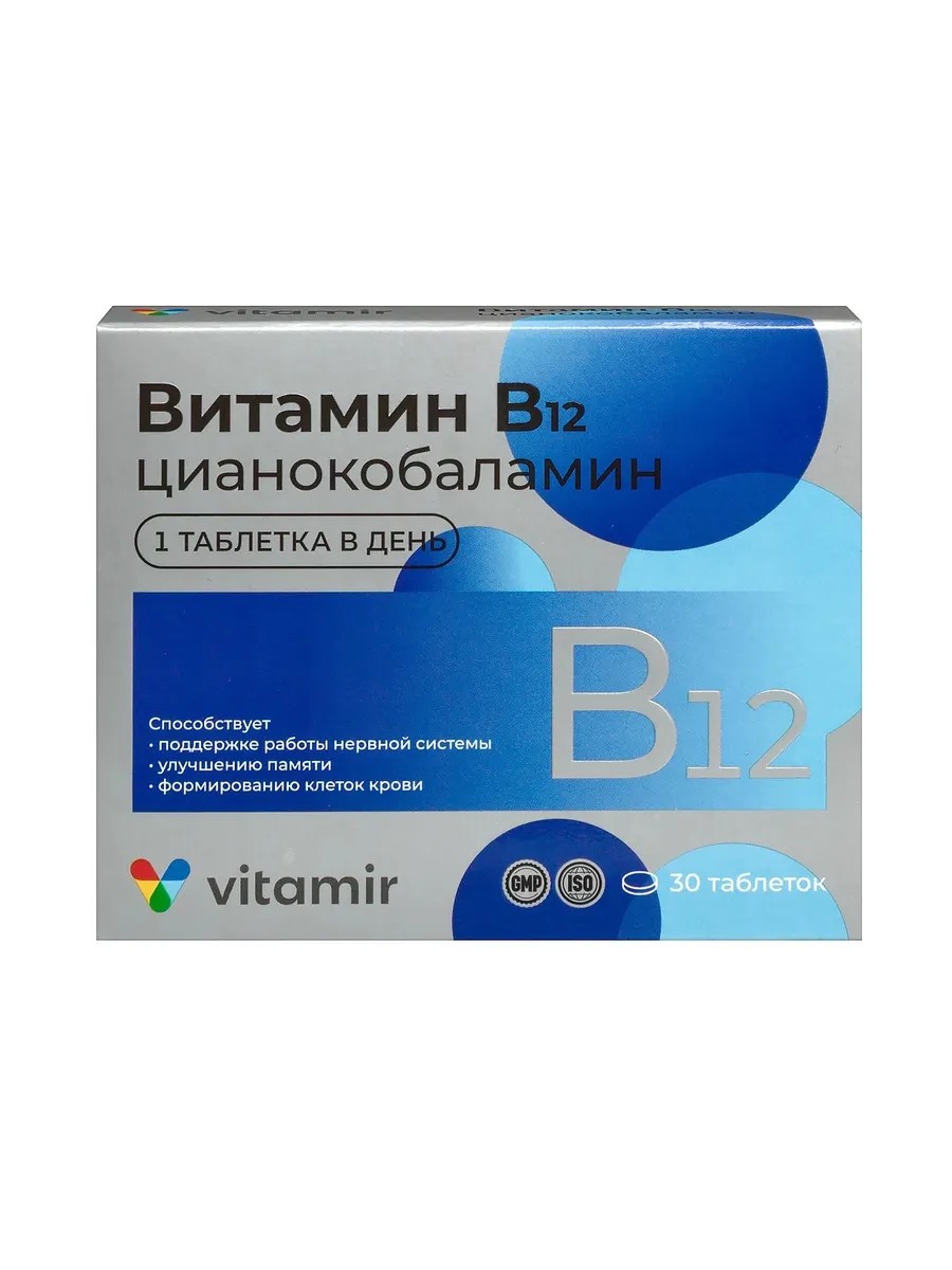 Витамин В 12 витамир - это препарат, который содержит витамин В12 (цианокобаламин) в дозировке 7 мкг в каждой таблетке. Витамин В12 - важный компонент для нормального функционирования головного мозга, нервной системы и формировании кровяных клеток.. Его дефицит может привести к различным заболеваниям, таким как анемия, депрессия, склероз и т.д.