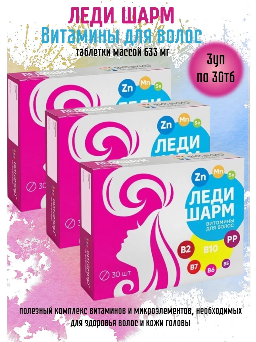 Леди Шарм витамины для волос - это биологически активная добавка (БАД) к пище - полезный комплекс витаминов и микроэлементов, необходимых для здоровья волос и кожи головы. Он содержит витамины группы В, дрожжи пивные, цинк, инулин, селен и другие полезные вещества, которые оказывают благотворное влияние на состояние волос, кожи, активизируя регенеративные процессы в волосах, ногтевых пластинах, укрепляет организм в целом, повышая устойчивость к инфекциям и стрессовым ситуациям. Инулин является питательной средой (пребиотиком) для бифидо- и лактобактерий, являющихся представителями нормальной микрофлоры кишечника, он способствует росту полезной микрофлоры.