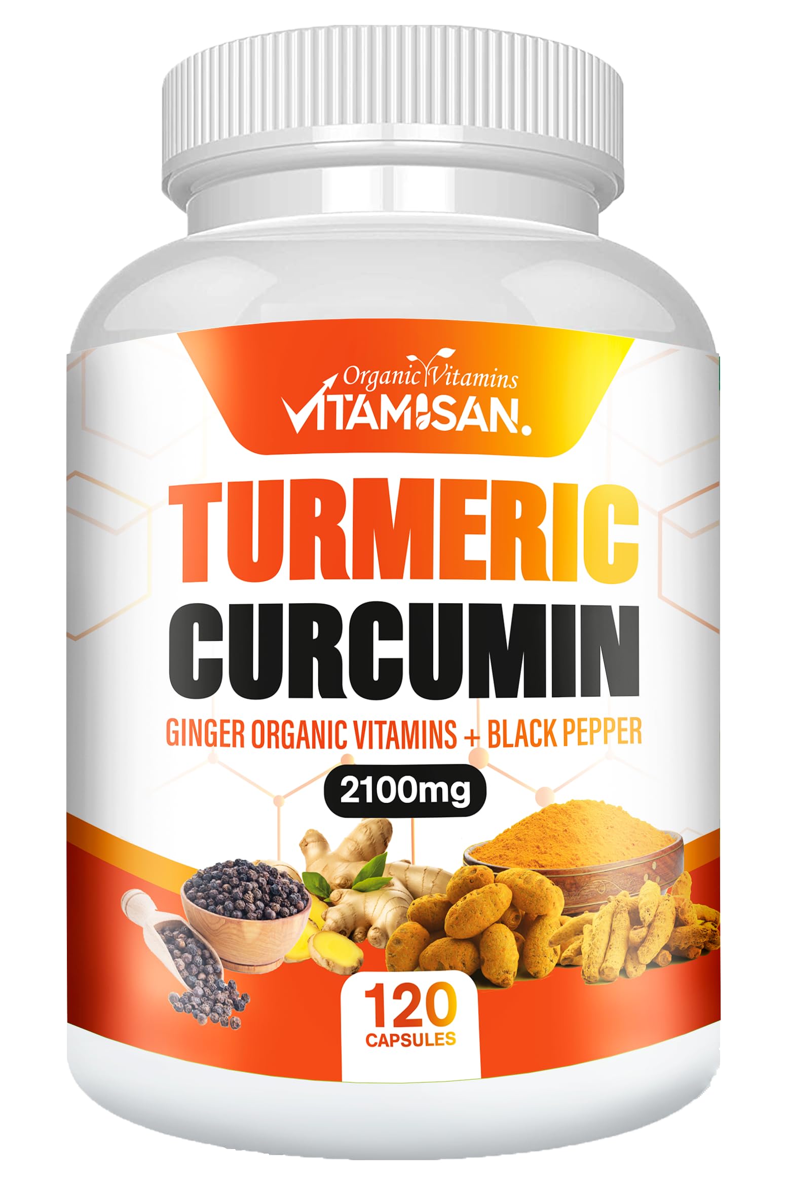 Support Your Natural Balance with Vitamisan Turmeric Curcumin Experience the benefits of a high-potency herbal blend with Vitamisan's Turmeric Curcumin, enhanced with Ginger and Black Pepper for optimal absorption. Our formula is made with high-quality, non-GMO ingredients to help support your overall wellness. Each bottle provides 120 capsules — a 40-day supply — designed to complement an active lifestyle and daily balance. Why Choose Vitamisan? ✓ 2100 mg per serving ✓ With ginger and black pepper for enhanced absorption ✓ Non-GMO, gluten-free, no artificial fillers or preservatives ✓ Made in GMP-certified facilities Support your wellness naturally — with a turmeric supplement you can trust. These statements have not been evaluated by the Food and Drug Administration. This product is not intended to diagnose, treat, cure, or prevent any disease.