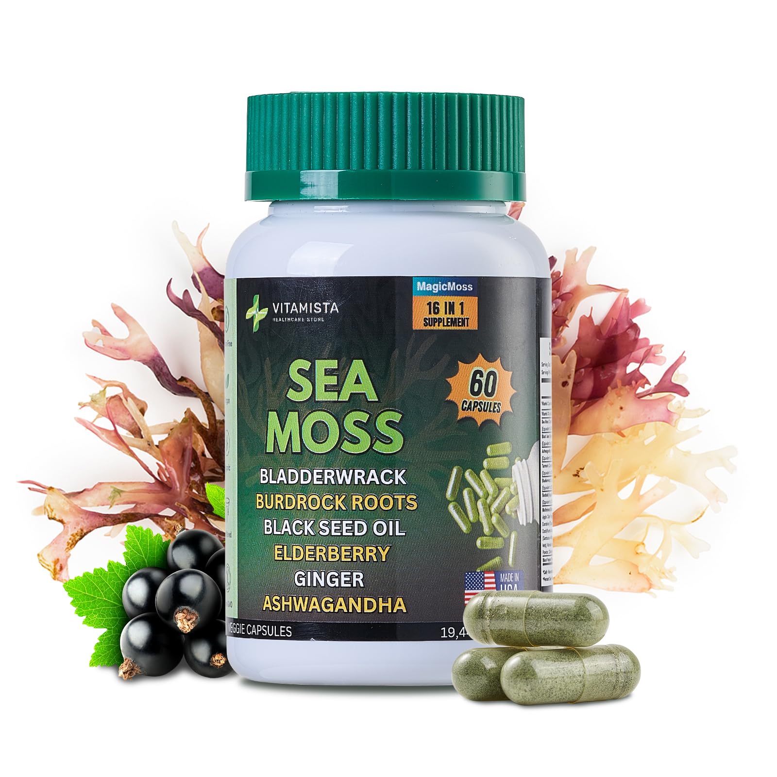 : Whether you're searching for sea moss for women, sea moss pills for women, or advanced sea moss for men, VITAMISTA Sea Moss Capsules provide comprehensive benefits for your body and mind. Boost energy, support immunity, and nourish your system with this all-in-one superfood. Perfect for anyone seeking seamoss supplements or sea moss vitamins for women to elevate their health naturally. , - , : Crafted with 100 plant-based, organic ingredients, our sea moss pills are vegan-friendly, gluten-free, and free from harmful additives. Made with sustainably sourced musgo marino and designed for all dietary needs, this advanced sea moss supplement ensures you receive the highest quality nutrition in every serving. : Packed with nutrient-dense sea moss and other detoxifying ingredients, our capsules help cleanse your body from toxins while supporting gut health and digestion. Ideal for those looking to maintain a balanced diet or enhance their detox routine, this sea moss supplement is a natural way to promote internal cleansing and wellness. , , : Enriched with essential vitamins and minerals, these sea moss vitamins for women and men are designed to strengthen your immune system, enhance energy levels, and promote overall vitality. Whether you're searching for "infinite age sea moss advanced superfood" or the "best sea moss capsules," our formula delivers unmatched quality and results for daily health and active lifestyles. - - : Discover the power of nature with our premium sea moss capsules featuring 19,445mg of Irish Sea Moss, Bladderwrack, Burdock Root, and Black Seed Oil. This advanced sea moss supplement is enhanced with Ashwagandha, Elderberry, Ginger, and Turmeric, offering a potent blend of superfoods to support your overall health, immunity, and vitality. Perfect for both men and women seeking natural wellness.