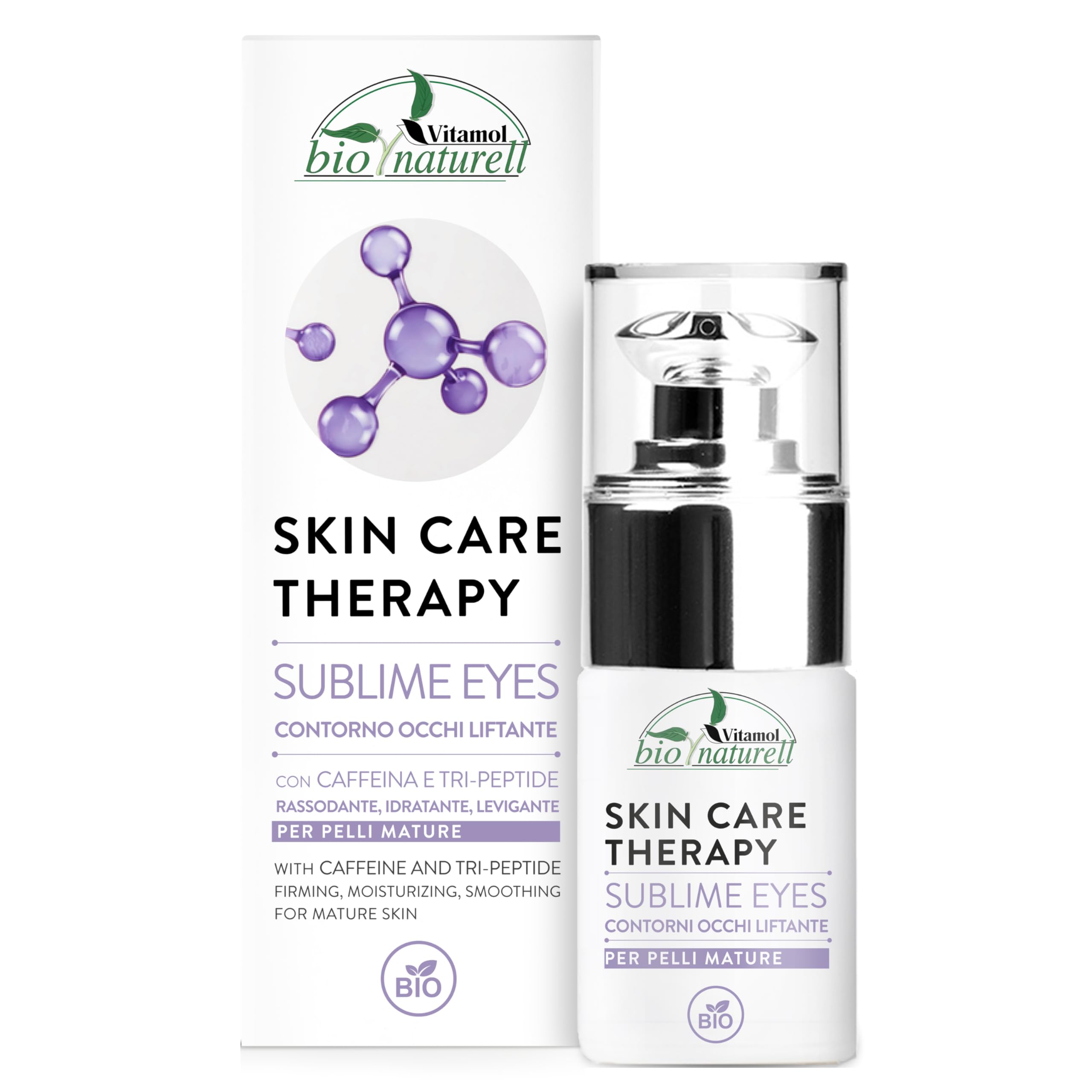 Discover our advanced eye contour treatment: hydrates, protects, and reduces puffiness and dark circles. The formula with TRI-PEPTIDE provides an instant lifting effect and long-term regeneration, combats signs of aging, and stimulates collagen production to reduce wrinkles and sagging skin. Enriched with organic shea butter, caffeine, and organic coconut oil to hydrate, improve circulation, and protect the delicate skin around the eyes. Enhance the beauty of your eyes with our advanced eye contour treatment. This gentle yet powerful product delivers deep hydration and targeted protection, visibly reducing puffiness and dark circles for a bright and radiant look. The innovative formula enriched with TRI-PEPTIDE provides an immediate lifting effect and promotes lasting skin regeneration over time. It actively combats the signs of aging, stimulating the natural production of collagen to reduce wrinkles and sagging skin, offering a more youthful and refreshed appearance. Organic shea butter, known for its ultra-hydrating properties, penetrates deep into the skin, providing long-lasting moisture and a comforting softness. The presence of caffeine improves blood circulation and increases skin elasticity, visibly reducing signs of fatigue and stress around the eyes. Furthermore, organic coconut oil, with its protective and nourishing properties, creates a natural shield against harmful external agents, while keeping skin soft, supple, and radiant. Discover the secret to a bright, youthful look with our eye cream, enriched with natural ingredients and formulated with the utmost care for your beauty and well-being. Purely organic Vegan Sulfate-free Paraben-free Silicone-free Cruelty-free? Purely organic Vegan Sulfate-free Paraben-free Silicone-free Cruelty-free. ? Intense hydration and reduction of signs of fatigue and stress around the eyes. Stimulates natural collagen production to reduce wrinkles and sagging skin. ? Instant lifting and long-term regenerative action by combating signs of aging. ? Advanced eye contour treatment that hydrates, protects, and reduces puffiness and dark circles.Vitamol Bio Naturell Sublime Eyes contour des yeux Anti-rides liftant Hydrate protège et réduit les poches et les cernes 15 mlDESCRIPTION DU PRODUIT Découvrez notre traitement contour des yeux avancé : hydrate, protège et réduit les poches et les cernes. La formule avec TRI-PEPTIDE offre un lifting instantané et régénérant à long terme, combat les signes du vieillissement, stimule le collagène en réduisant les rides et le relâchement cutané. Avec du beurre de karité BIO, de la caféine et de l'huile de coco bio pour hydrater, améliorer la circulation et protéger la peau délicate des yeux. Améliorez la beauté de vos yeux avec notre traitement avancé pour le contour des yeux. Ce produit délicat mais puissant offre une hydratation profonde et une protection ciblée, réduisant visiblement les poches et les cernes pour un regard lumineux et éclatant. La formule innovante enrichie en TRI-PEPTIDE donne un effet lifting immédiat et favorise une régénération durable de la peau dans le temps. Combat activement les signes du vieillissement, stimulant la production naturelle de collagène pour réduire les rides et la relaxation cutanée, offrant un aspect plus jeune et frais. Le beurre de karité BIO, connu pour ses propriétés ultra-hydratantes, pénètre en profondeur dans les tissus, apportant une hydratation durable et une douceur enveloppante. La présence de caféine améliore la circulation sanguine et augmente l'élasticité de la peau, réduisant visiblement les signes de fatigue et de stress autour des yeux. En outre, l'huile de coco BIO, avec ses propriétés protectrices et nourrissantes, crée un bouclier naturel contre les agents extérieurs nocifs, tout en gardant la peau douce, élastique et éclatante. Découvrez le secret pour un regard lumineux et jeune avec notre contour des yeux, enrichi en ingrédients naturels et formulé avec le plus grand soin pour votre beauté et votre bien-être. purement biologique végétalien sans sulfates sans parabènes Sans silicone Cruelty-free? purement biologique végétalien sans sulfates sans parabènes Sans silicone Sans cruauté. ? Hydratation intense et réduction des signes de fatigue et de stress autour des yeux. Stimule la production naturelle de collagène pour réduire les rides et le relâchement cutané. ? Lifting instantané et action régénératrice à long terme en combattant les signes du vieillissement. ? Traitement avancé pour le contour des yeux qui hydrate, protège et réduit les poches et les cernes.