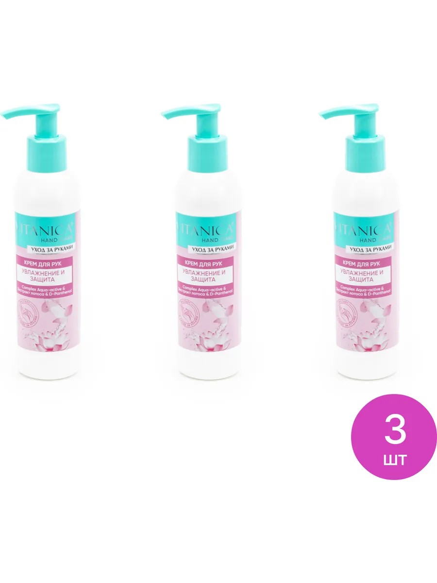 Vitanica / Vitanica Hand Cream Moisturizing and Protective for All Skin Types with Shea Butter, D-Panthenol, and Lotus Extract, 200ml / Cosmetics. Set of 3. Price per set. Vitanica Moisturizing Hand Cream will give you an instant boost of life-giving moisture. The natural formula contains effective complexes of caring ingredients that provide optimal hand care. The melt-in texture of this moisturizing cream absorbs easily and quickly, leaving no filmy or sticky feeling, and its fresh scent will accompany you throughout the day. The AQUA-ACTIVE complex intensively moisturizes the skin of your hands, prevents moisture loss, and relieves dryness and tightness. This nourishing hand cream from Vitanica will make your hands flawless in an instant! Cosmetics / Moisturizing Cream / Hand Nutrition Ingredients: Water (Aqua), Cetearyl Alcohol, White Mineral Oil, Glycerin, Ceteareth-20, Hydrolyzed Wheat Protein, Hydrolyzed Soy Protein, Lotus Extract, Aloe Extract, Butyrospermum Parkii Butter, Panthenol, Glyceryl Stearate SE, Propylene Glycol, Carbomer, Parfum (Fragrance), Phenoxyethanol, Disodium EDTA, Triethanolamine.