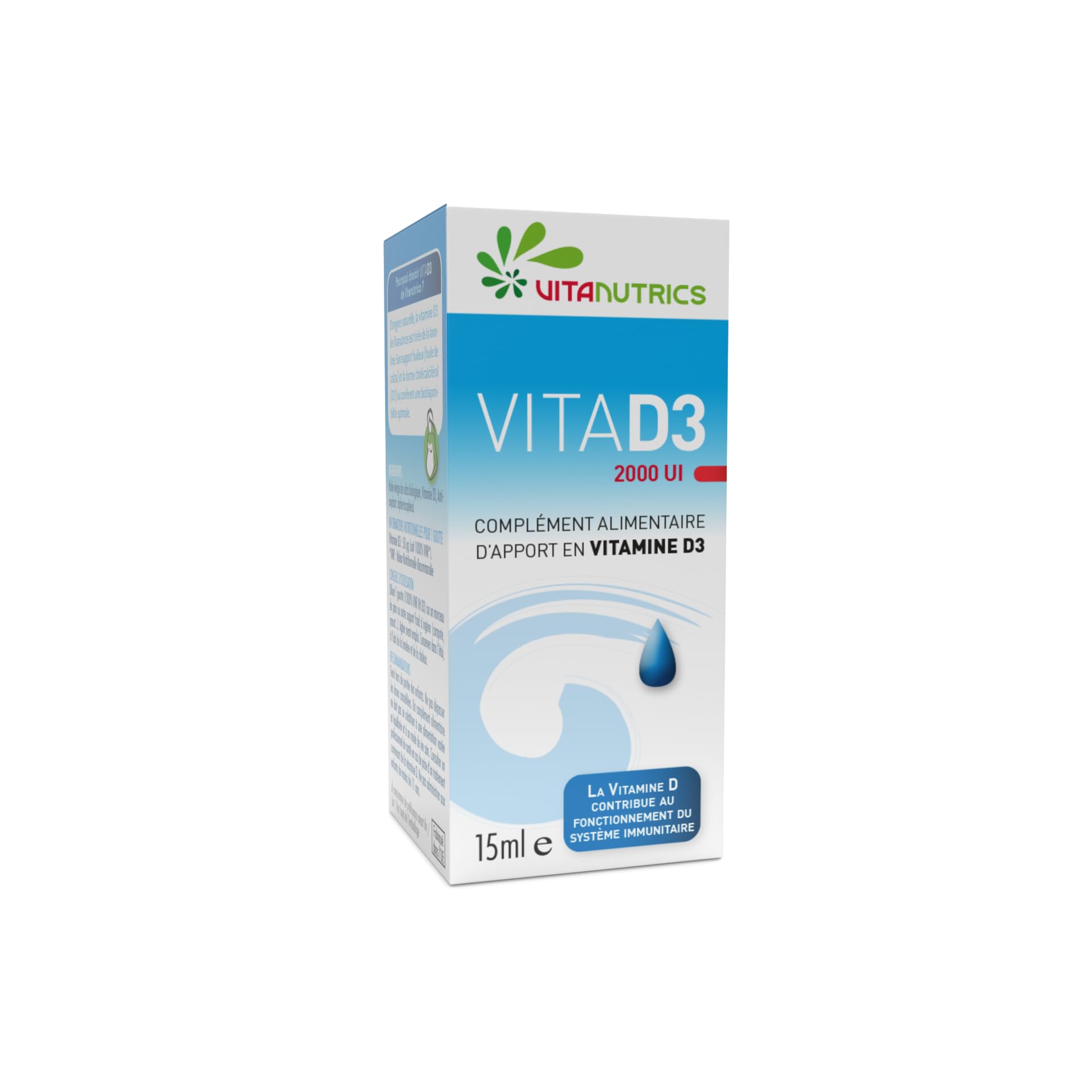 UNE APPROCHE GLOBALE DU BIEN-ETRE DEPUIS 2012 : Chez Vitanutrics, nous vous proposons des compléments alimentaires riches en micronutriments - vitamines, oligo-éléments, antioxydants, probiotiques, oméga 3, actifs de plantes - utilisés par notre corps pour favoriser notre santé physique et psychique. Chacune de nos formules est conçue et développée par notre équipe en Belgique, forte d'une expertise de plus de 15 ans dans la micronutrition. CONSEILS D'UTILISATION : VITAD3 est recommandé pour les nourrissons, les enfants, les femmes enceintes, allaitantes, ménopausées, et les séniors. Pour les adultes et adolescents de plus de 11 ans, 1 goutte jour, pure ou sur un support (pain, yaourt, compote…). Ne pas donner à des enfants de moins de 11 ans. Pour les nourrissons et les enfants de moins de 11 ans, retrouvez VITAD3 400 UI Kids et VITAD3 1000UI. 100 D'ORIGINE NATURELLE : La vitamine D3 VITAD3 est fabriquée en France. Elle est composée à 100 d'ingrédients d'origine naturelle. VITAD3 est sans OGM, sans gluten, sans lactose, et sans additifs controversés. VITAD3 convient aux femmes enceintes. BIENFAITS DE LA VITAMINE D3 : La Vitamine D contribue au fonctionnement normal du système immunitaire. Elle favorise le maintien d'une ossature normale, d'une dentition normale et d'une fonction musculaire normale. Une supplémentation en vitamine D est également à envisager lors des périodes de croissance (adolescence), durant les changements de saisons, lors d'une période de faible exposition au soleil. FLACON GOUTTE, FORME HUILEUSE : VITAD3 est formulée avec de la lanoline et de l'huile vierge de colza bio qui sert de support à la vitamine D3. La forme huileuse est facile d'absorption et permet une meilleure assimilation par l'organisme. La présentation en flacon goutte convient particulièrement aux enfants et aux personnes éprouvant des difficultés à consommer des gélules. La concentration à 2000 UI par goutte représente 1000 de l'apport nutritionnel requis.