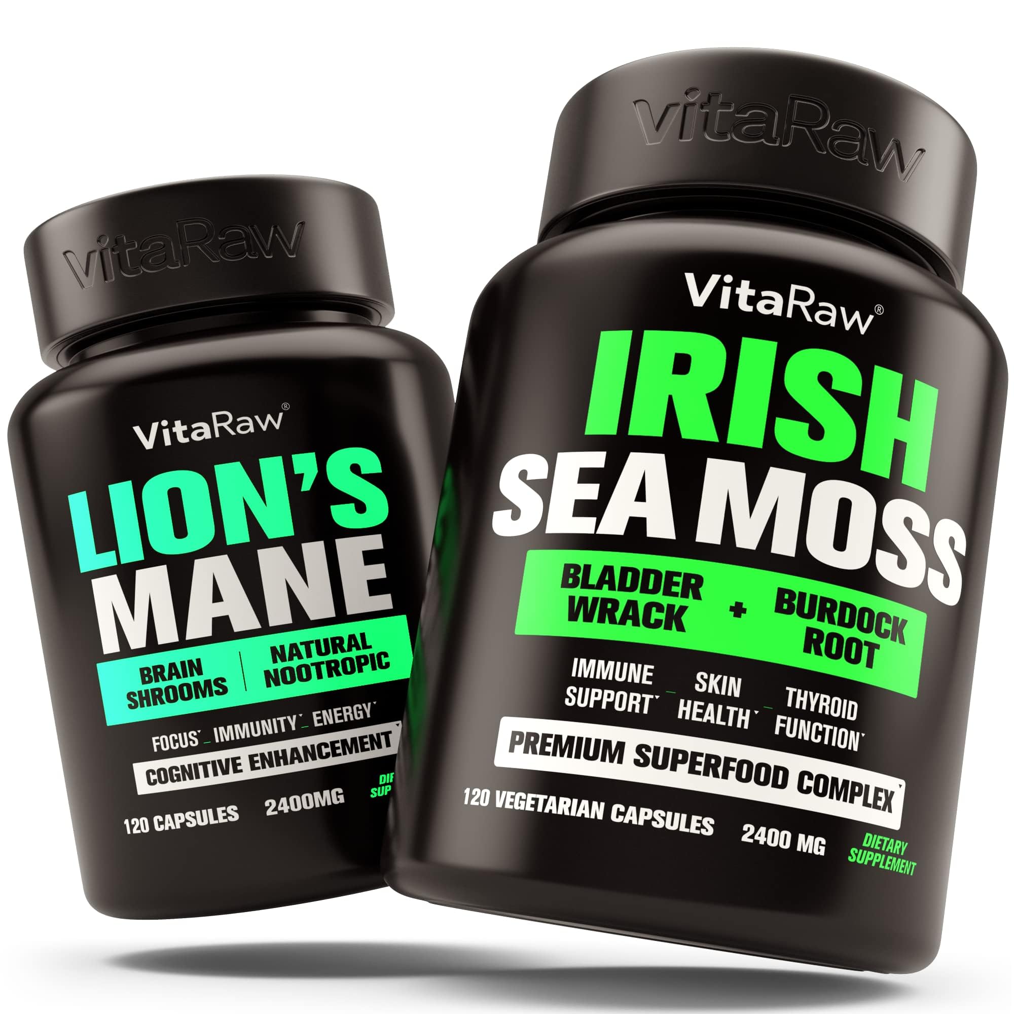 VitaRaw Lions Mane Mushroom + Irish Sea Moss - Brain Booster Memory & Energy + Immune Support Joint & Thyroid and Gut Health