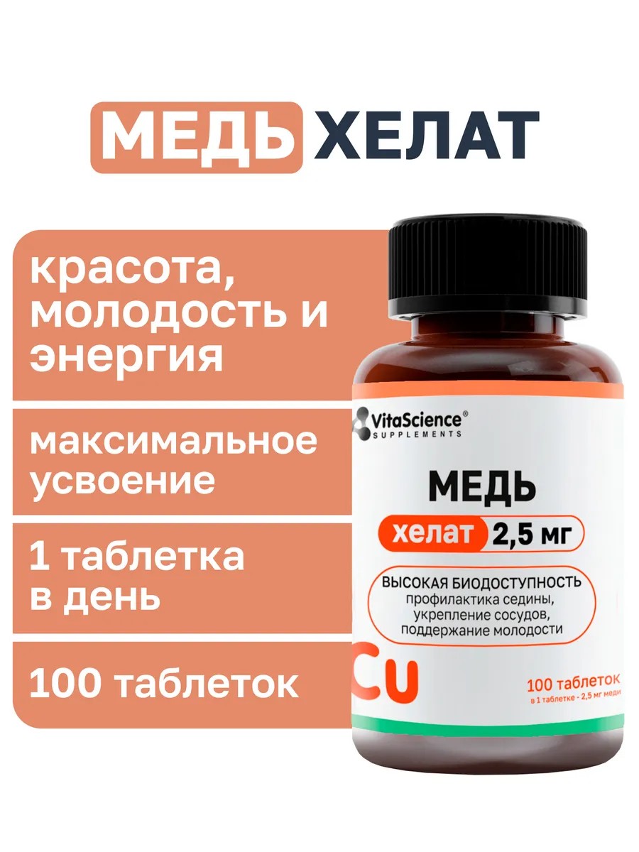 Медь бисглицинат от VitaSciencel — это источник меди в хелатной форме бисглицината, в таблетках.