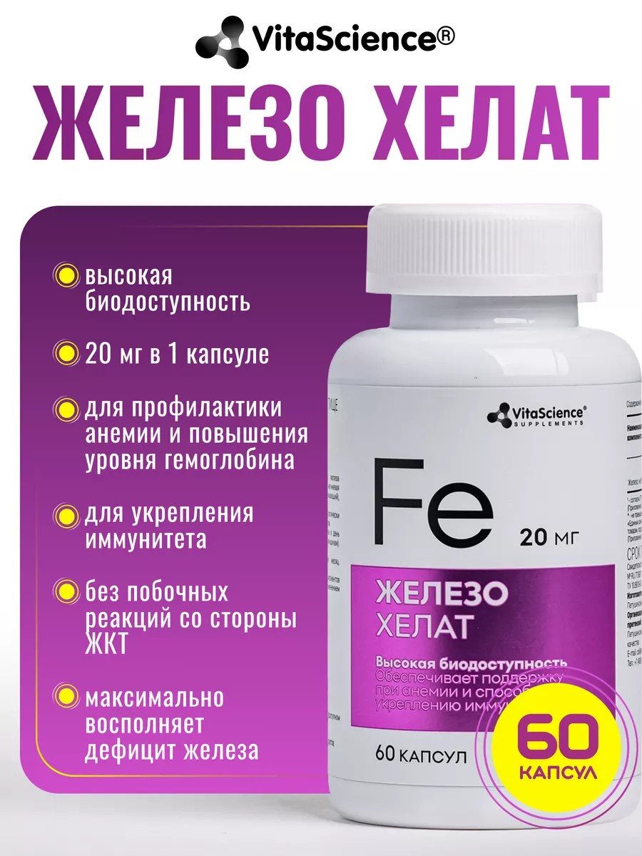 Железо Хелат БАД витамины для энергии и жизни. Железо в легкодоступной форме хелата Витасайнс хорошо усваивается без побочных эффектов со стороны ЖКТ. Восполняет дефицит железа без отложения в почках, суставах и сосудах. Максимальное содержание железа в 1 капсуле. Железо хелат способствует поддержанию нормального уровня ферритина и гемоглобина, снижению риска развития анемии, усталости и повышению работоспособности. Дефицит железа - один из самых распространенных видов недостаточности питательных веществ: по данным ВОЗ, от него страдают около 30 % населения мира. Чаще всего с нехваткой этого минерала в организме сталкиваются женщины, что обусловлено его физиологическими потерями, а также люди старше 60 лет, у которых дефицит железа нередко развивается при инфекционных, воспалительных