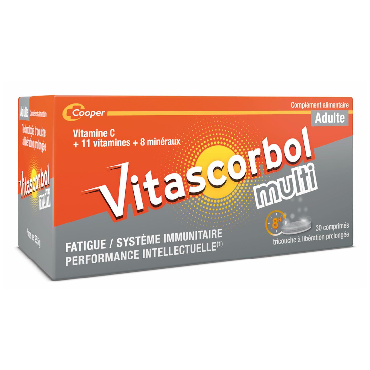 Are the bouts of fatigue increg? Are you lacking energy? Regain tone(1), and boost your immune system(1) thanks to the food supplement VitascorbolMulti Adult 30 tablets. Stock up on energy Composed of vitamin C, 11 other vitamins and 8 minerals, the food supplement VitascorbolMulti 30 tablets contributes to the proper functioning of the immune system(1), while reducing fatigue(1) and boosting physical(1) and intellectual(2) performance. Prolonged action Thanks to its three-layer prolonged release technology, VitascorbolMulti Adult 30 tablets allows the active ingredients (vitamins, minerals, etc.) to be absorbed gradually and optimally by the body. • 1 tablet per day for 30 days • Tri-layer technology for optimal absorption (1) Vitamin C helps reduce fatigue and maintain the immune system. (2) Vitamin B5 contributes to normal intellectual performance. INGREDIENTS Ingredients for 1 tablet: Bulking agent: Microcrystalline cellulose, L-ascorbic acid (Vitamin C), Magnesium oxide, Iron fumarate, Nicotinamide (Vitamin B3), Zinc bisglycinate, Stabilizer: Hydroxypropylmethylcellulose, Bulking agent: Dicalcium phosphate, DL-alpha-tocopheryl acetate (Vitamin E), Anti-caking agents: Cross-linked sodium carboxymethylcellulose, Silicon dioxide [nano], Magnesium stearate, Polyvinylpolypyrrolidone, Calcium D-pantothenate (Vitamin B5), Anti-caking agent: Polyvinylpyrrolidone, Retinyl acetate (Vitamin A), Pyridoxine hydrochloride (Vitamin B6), Manganese sulfate, Riboflavin (Vitamin B2), Color: Iron oxide yellow, Thiamine mononitrate (Vitamin B1), Copper glycinate, Color: Iron oxide red, Cyanocobalamin (Vitamin B12), Flavoring, Cholecalciferol (Vitamin D, soybean oil), Sodium molybdate (Molybdenum), Sweetener: Sucralose, Chromium chloride, Sweetener: Acesulfame potassium, Folic acid (Vitamin B9), Sodium Selenite (Selenium), D-biotin (Vitamin B8). DIRECTIONS FOR USE VitascorbolMulti 30 Tablets should be taken at the rate of one effervescent tablet per day with a glass of water, preferably in the morning and during a meal, for 30 days. This program can be renewed several times a year if necessary. Do not exceed the recommended daily dose. Does not replace a varied and balanced diet or a healthy lifestyle. Keep out of reach of young children. Store at a temperature not exceeding 25 C. ? VITASCORBOL: The brand of hyper vitality in pharmacies! Rich in vitamin C, Vitascorbol offers a wide range of food supplements to help reduce fatigue and maintain the immune system . Vitamin C contributes to reducing fatigue and the normal functioning of the immune system. SIMPLE TO USE: VitascorbolMulti 30 Tablets should be taken at a rate of one effervescent tablet per day with a glass of water, preferably in the morning and during a meal, for 30 days. LONG-TERM ACTION: Thanks to its prolonged-release tri-layer technology, VitascorbolMulti Adult 30 tablets allows the active ingredients (vitamins, minerals, etc.) to be absorbed gradually and optimally by the body. FILL UP ON ENERGY: Composed of vitamin C, 11 other vitamins and 8 minerals, the VitascorbolMulti 30 tablets food supplement contributes to the proper functioning of the immune system , while reducing fatigue and boosting physical and intellectual performance. Vitamin C contributes to reducing fatigue and maintaining the immune system. Vitamin B5 contributes to normal intellectual performance. MULTI-VITAMIN FOOD SUPPLEMENT: Are you feeling incregly tired? Are you lacking energy? Regain your energy and boost your immune system with the VitascorbolMulti Adult 30 tablets food supplement. Vitamin C contributes to reducing fatigue and maintaining the immune system. Les coups de fatigue se multiplient ? Vous manquez d'énergie ? Retrouvez du tonus(1), et booster votre système immunitaire(1) grâce au complément alimentaire VitascorbolMulti Adulte 30 comprimés. Faites le plein d'énergie Composé de vitamine C, de 11 autres vitamines et 8 minéraux, le complément alimentaire VitascorbolMulti 30 comprimés contribue au bon fonctionnement du système immunitaire(1), tout en réduisant la fatigue(1) et boostant les performances physiques(1) et intellectuelles(2). Une action prolongée Grâce à sa technologie tri-couche à libération prolongée, VitascorbolMulti Adulte 30 comprimés permet aux actifs (vitamines, minéraux…) d'être absorbés progressivement et de manière optimale par l'organisme. • 1 comprimé par jour pendant 30 jours • Technologie tri-couche pour une absorption optimale (1) La vitamine C contribue à réduire la fatigue et au maintien du système immunitaire. (2) La vitamine B5 contribue à des performances intellectuelles normales. INGRÉDIENTS Ingrédients pour 1 comprimé : Agent de charge : Cellulose microcristalline, Acide L-ascorbique (Vitamine C), Oxyde de magnésium, Fumarate de fer, Nicotinamide (Vitamine B3), Bisglycinate de zinc, Stabilisant : Hydroxypropylméthylcellulose, Agent de charge : Phosphate dicalcique, Acétate de DL-alpha-tocophéryle (Vitamine E), Anti-agglomérants : Carboxymethylcellulose de sodium réticulée, Dioxyde de silicium [nano], Stéarate de magnésium, Polyvinylpolypyrrolidone, D-pantothénate de calcium (Vitamine B5), Anti-agglomérant : Polyvinylpyrrolidone, Acétate de rétinyle (Vitamine A), Chlorhydrate de pyridoxine (Vitamine B6), Sulfate de manganèse, Riboflavine (Vitamine B2), Colorant : Oxyde de fer jaune, Mononitrate de thiamine (Vitamine B1), Glycinate de cuivre, Colorant : Oxyde de fer rouge, Cyanocobalamine (Vitamine B12), Arômes, Cholécalciférol (Vitamine D, huile de soja), Molybdate de sodium (Molybdène), Edulcorant : Sucralose, Chlorure de chrome, Edulcorant : Acésulfame de potassium, Acide folique (Vitamine B9), Sélénite de sodium (Sélénium), D-biotine (Vitamine B8). MODE D'EMPLOI VitascorbolMulti 30 Comprimés est à prendre à raison d'un comprimé effervescent par jour avec un verre d'eau de préférence le matin et au cours d'un repas, et ce pendant 30 jours. Ce programme pe