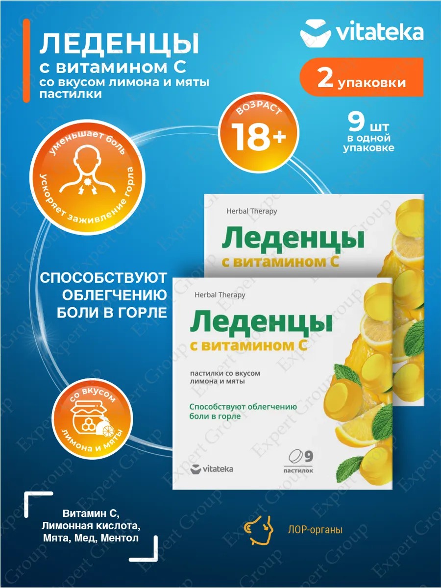 Vitateka Vitamin C Lozenges with Lemon and Mint Flavor, 3g, 9 pcs./pack x 2 pcs. Throat lozenges with vitamin C soothe irritation and irritation, softening the unpleasant sensation in the throat.