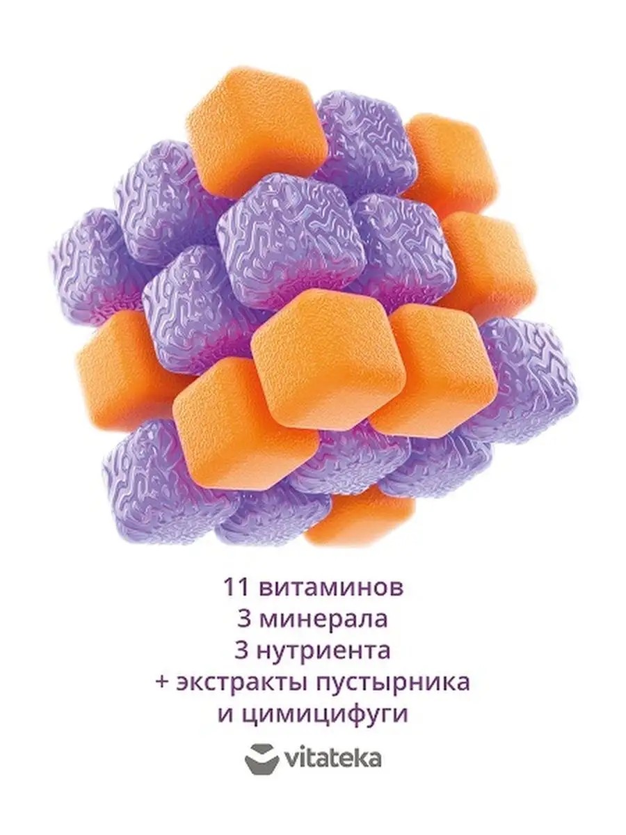 Комплекс витаминов и минералов VMC для женщин старше 45 лет от vitateka богат витаминами - А, группы В, С, Е, минералами - цинком, магнием и селеном, нутриентами - L-карнитином, гиалуроновой кислотой и рутином, а также содержит экстракты пустырника и цимицифуги. Бад от Витатека способствует поддержанию организма в период гормональных изменений. В составе: 11 витаминов; 3 минерала; 3 нутриента; экстракты пустырника и цимицифуги. Гиалуроновая кислота способствует глубокому увлажнению кожи, входит в состав синовиальной жидкости и суставную полость, обеспечивает внутрисуставную смазку, улучшает микроциркуляцию крови, стимулируя появление новых капилляров. Экстракт пустырника - компонент растительного происхождения, оказывающий успокаивающее действие, снижает частоту и увеличивает силу сердечных сокращений. Экстракт цимицифуги - вещество растительного происхождения, способствующее устранению психоэмоциональных и вегетососудистых нарушений в период климакса. Оказывает седативное действие. Принимать по 1 капсуле 1 раз в день взрослым женщинам после 45 лет.