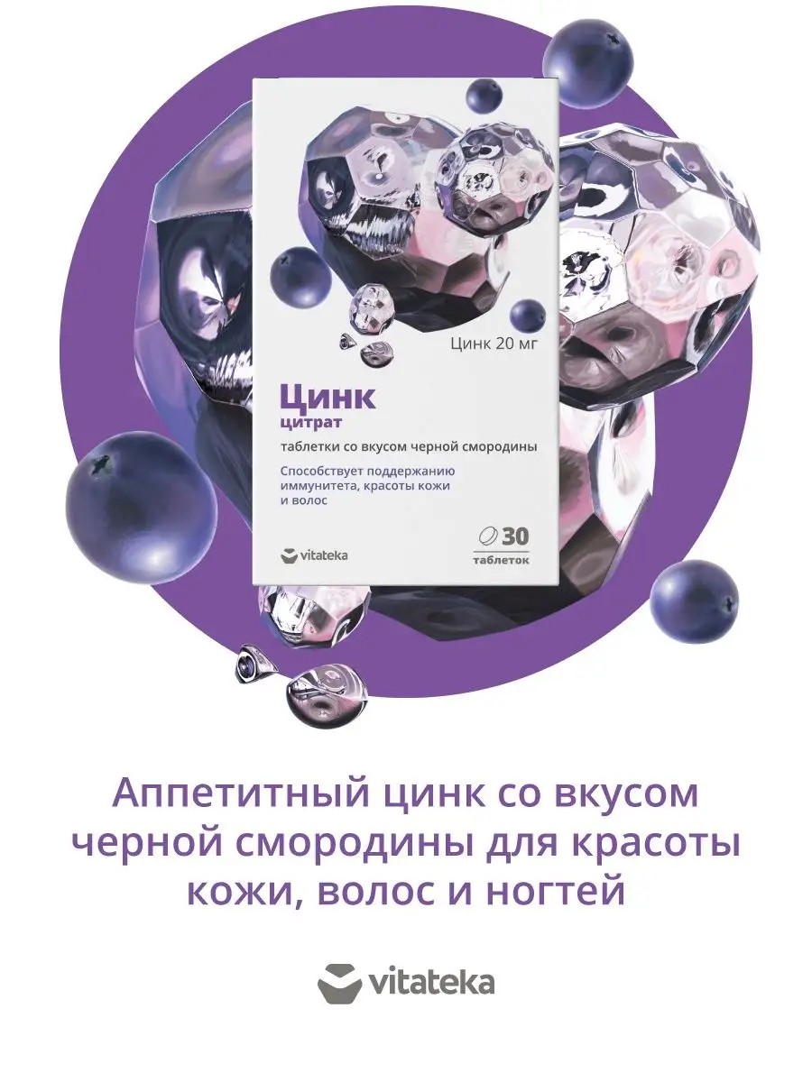 Цинк эссенциальный микроэлемент, участвующий в работе эндокринной и половой систем, иммунитета, целого ряда ферментов и гормонов. Цинк необходим для: укрепления иммунитета;улучшения пищеварения;предупреждения изменения вкусовых ощущений, обоняния;стимулирование репродуктивной функции;активизации выработки гормонов, нуклеиновых кислот, белков и т. п.;поддержания здоровья сердца;нормализации уровня сахара в крови;улучшению функции мозга;улучшения состояния кожи и волос. Обладает высокой степенью усвояемости (до 58 %) без побочных эффектов.Цинк цитрат vitateka выпускается в форме таблеток для рассасывания, что особенно важно для укрепления местного иммунитета. Вкус: черная смородина.1 таблетка содержит 20 мг цинка. Взрослым, по 1 таблетке в день сразу после еды. Таблетки следует рассасывать во рту до полного растворения. Продолжительность приема 4-6 недель. При необходимости прием можно повторить через месяц. Возможны повторные приемы в течение года. Не является лекарством.