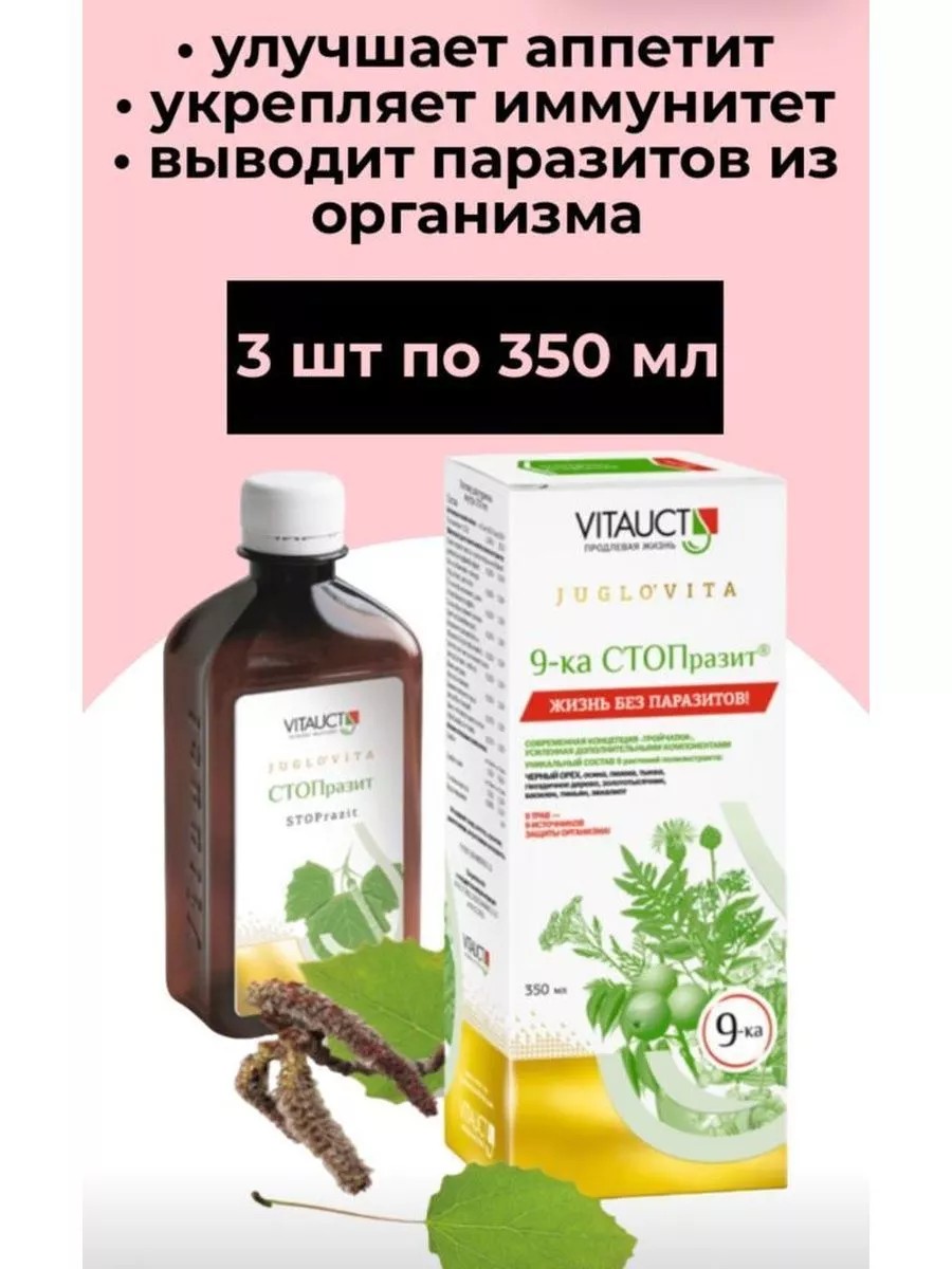 9-ка СТОПразит - МОЩНЫЙ УДАР ПО ПАРАЗИТАМ. Компоненты способствуют: Выведению паразитов и продуктов их жизнедеятельности (токсинов) из организма. Повышению устойчивости и сопротивляемости организма при повторной инвазии. Улучшению аппетита и пищеварения. Укреплению иммунной системы. СОВРЕМЕННАЯ КОНЦЕПЦИЯ «ТРОЙЧАТКИ» Полиэкстракт 9-ти лекарственных растений с доказанной выраженной противопаразитарной активностью и высоким профилем безопасности. Преимущества: НА ОСНОВЕ ЧЕРНОГО ОРЕХА - уникальный антипаразитарный компонент классической «Тройчатки».КОМПЛЕКСНОЕ ДЕЙСТВИЕ (бактерии, простейшие, грибы, гельминты). ШИРОКИЙ СПЕКТР АНТИГЕЛЬМИНТНОГО ДЕЙСТВИЯ (нематодозы, цестодозы, трематодозы). ВОЗДЕЙСТВИЕ НА ВСЕХ СТАДИЯХ РАЗВИТИЯ ГЕЛЬМИНТОВ(яйца, цисты, личинки, взрослые формы). ШИРОКИЙ СПЕКТР ПРИРОДНЫХ БАВ (биологически активные вещества). Благодаря комплексной полиэкстракции ― специальной каскадной технологии "СКАТ". ВЫСОКАЯ БИОДОСТУПНОСТЬ. Жидкая форма обеспечивает максимальное усвоение биологически активных веществ. ПОЛОЖИТЕЛЬНОЕ ВЛИЯНИЕ НА МИКРОФЛОРУ ОРГАНИЗМА. ДОПОЛНИТЕЛЬНЫЙ ИММУНОМОДУЛИРУЮЩИЙ И ПРОТИВОВОСПАЛИТЕЛЬНЫЙ ЭФФЕКТ. Способ применения: Взрослым по 10 мл (2 мерные или чайные ложки) 2-3 раза в день во время еды. Можно разбавить или запить водой. Перед применением взбалтывать! Курс приема 30 дней. Повторные курсы через 3-6 месяцев. Особые указания: Не содержит сахарозы алкоголя красителей ароматизаторов вкусовых добавок. Не влияет на способность управлять автомобилем и работать со сложными техническими устройствами. В первые дни приема возможен легкий и непродолжительный слабительный эффект, обусловленный действием сорбита. Не является лекарством. Указания для больных сахарным диабетом:9-ка СТОПразит не содержит сахара. 2 чайные ложки (10 мл) содержат не более 2,4 г сорбита, что соответствует не более 0,2 ХЕ. 1 ХЕ равна количеству продуктов питания, в котором содержится 10-12 г углеводов.