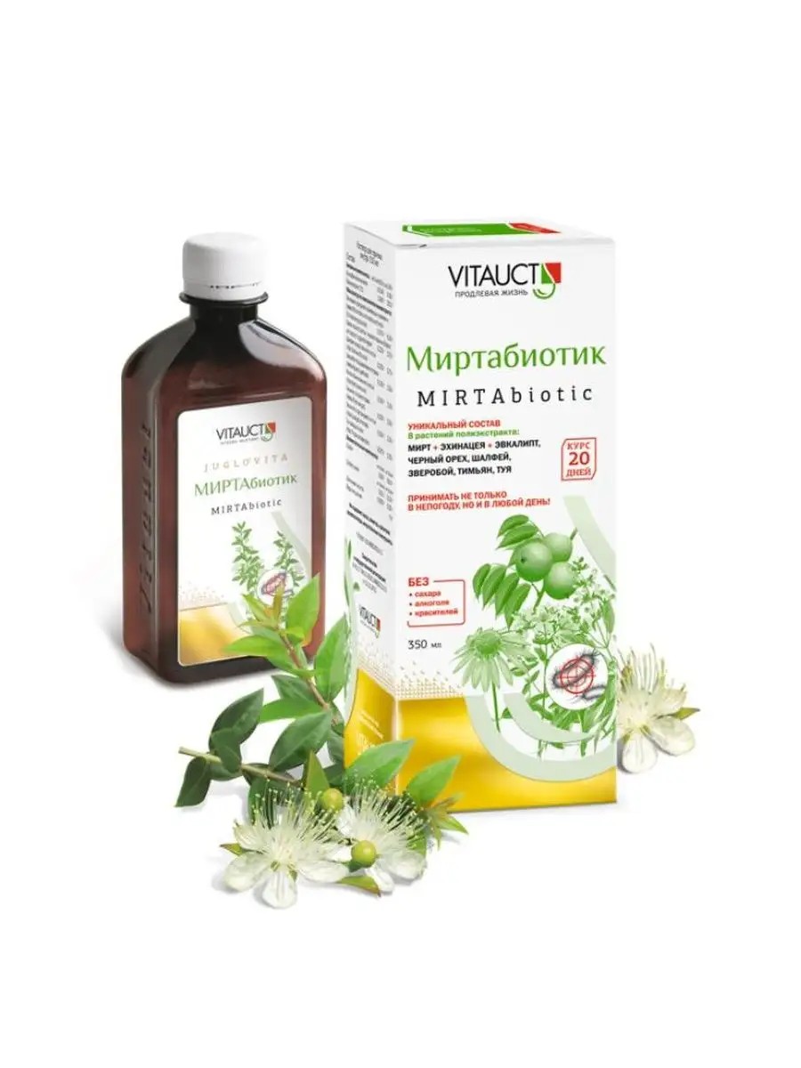 Миртабиотик ВИТАУКТ - формула активного итммунитета.Надежно и незаметно защититне только в непогоду, но и в любой день!МИРТАбиотик — поможет иммунитету стать еще сильнее.КОМПОНЕНТЫ СПОСОБСТВУЮТ:\- укреплению иммунитета\- повышению сопротивляемости организма к простудам и инфекциям\- снижению риска развития осложненийПРЕИМУЩЕСТВА КОМПЛЕКСА* УНИКАЛЬНЫЙ СОСТАВ!Не имеющий аналогов фитокомплекс на основе Эхинацеи пурпурной, усиленный Миртом обыкновенным* СОДЕРЖИТ НЕ ТОЛЬКО ТРАВУ ЭХИНАЦЕИ, НО И КОРНЕВИЩА С КОРНЯМИ,что расширяет спектр действия фитокомплекса. Эхиназиды — самый полезный компонент растения — аккумулируется в корнях, в незначительных количествах присутствует в цветке. Они обладают мощной активностью в отношении вирусов, бактерий, грибков и простейших* КОМПЛЕКСНОЕДЕЙСТВИЕ:8 лекарственных растений полиэкстракта + витамин С* МАКСИМУМ АКТИВНЫХ КОМПОНЕНТОВ!Соотношение растительного сырья и готового продукта (1:2)* КУРС ПРИЕМА 2-3 недели* СВОЙСТВА КОМПОНЕНТОВ * Повышают устойчивость организма к простудным и инфекционным заболеваниям, обладают адаптогенным действием. * Обладают широким спектром антимикробного действия. Активны как в отношении грамположительных, так и грамотрицательных микроорганизмов. * Обладают бактерицидным, фунгицидным, противовирусным (включая герпес и грипп), противопротозойным и противовоспалительным действиями. * Усиливают процессы регенерации (заживление ран и трофических язв).