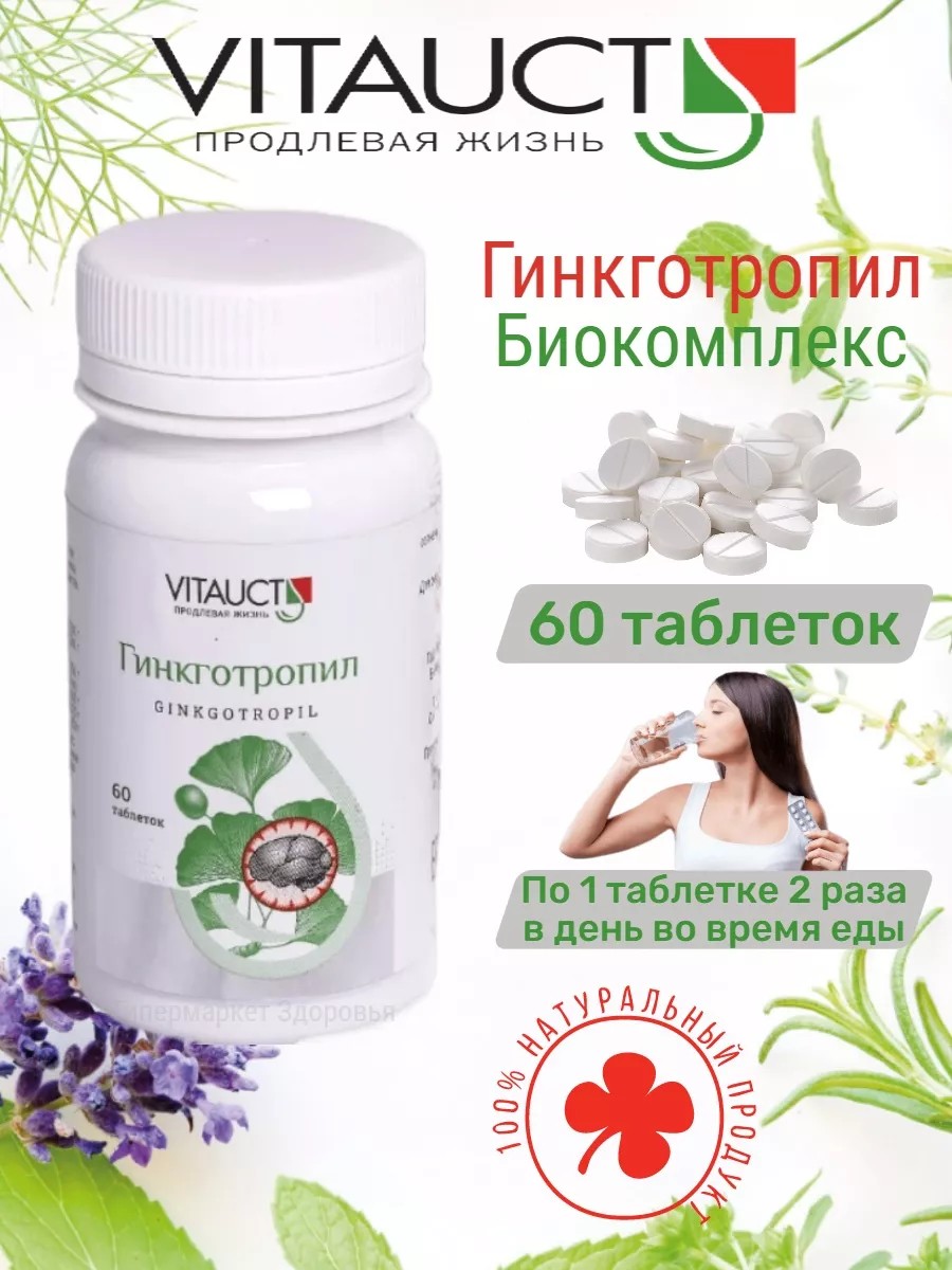 Гинкготропил с экстрактом гинкго двулопастного является средством, насыщает ткани кислородом и улучшает микроциркуляцию сосудов. Препарат гинко способствует улучшению памяты и укрепляет стенки сосудов. Его прием благотворно действует на сердечно-сосудистую систему, что уменьшает развитие инфарктов и инсультов.Данное средство ускоряет ликвидацию последствий инсульта и инфаркта миокарда, улучшая кровоток в сосудах миокарда глаза почек и других органов. Средство гинкобилоба снижает тромбообразование, помогает справиться с такими симптомами, как шум в ушах и головокружение. Также оно способно облегчить мигрени и нарушения памяти, связанные с болезнью Альцгеймера.Гинкготропил можно принимать при состоянии после инсульта или инфаркта миокарда для поддержки организма. Гинкгобилоба полезно при нарушении зрения, может помочь при бессоннице и облегчить симптомы варикоза или геморроя. Это средство подходит для тех, кто сталкивается с нарушениями кровообращения и сопутствующими заболеваниями такими как гипертония или диабет. Прием таблеток также поддерживает организм в условиях нервного напряжения или постковидных состояний за счет антигипоксического действия. Для получения максимальной пользы рекомендуется взрослым по 1 таблетке дважды в день во время еды. Таблетки можно рассасывать, разжевывать или проглатывать целиком запивая водой.Уникальность этого средства проявляется через его широкий спектр действия на организм человека. Насыщение тканей кислородом сочетается с положительным эффектом на процессы микроциркуляции что обеспечивает укрепление здоровья как на физическом так и на психологическом уровне.Кроме того это натуральное средство безопасно в применении благодаря тщательно подобранному составу что позволяет использовать его длительное время без ущерба для организма. Улучшение памяты нормализация сна снижение частоты приступов мигрени — это лишь некоторые из положительных эффектов которые могут заметить пользователи принимая данный препарат регулярно.***Не является лекарством (бад). Перед применением бад проконсультируйтесь с врачом. Фото биологически активной добавки может отличаться от полученного вами товара, так как производитель вправе менять внешний вид упаковки..