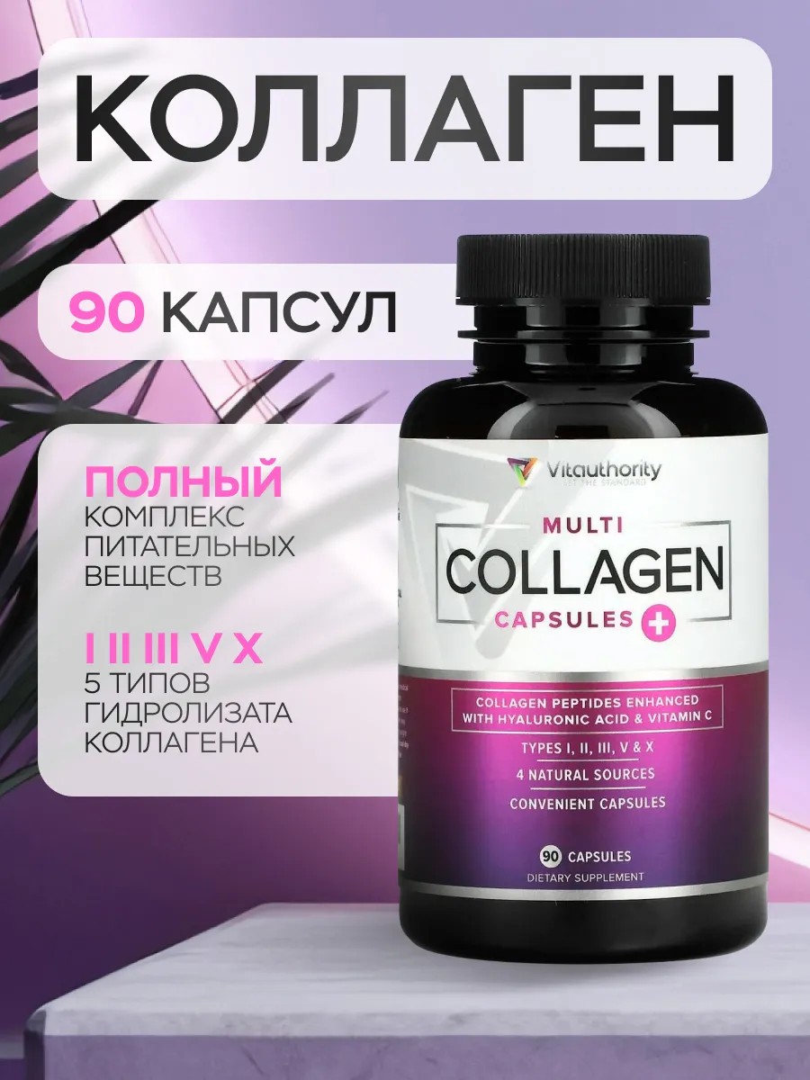 Витамины Vitauthority мульти Коллаген - содержит 5 типов пептидов коллагена премиум-класса в быстро усваивающихся капсулах,а также гиалуроновую кислоту и витамин C, которые работают на клеточном уровне, помогая поддерживать здоровье костей, суставов и пищеварения, придавая волосам, коже и ногтям молодой вид.Витаминный комплекс объединяет 5-коллагеновые пептиды в эффективную смесь 100% говядины, курицы, яичной скорлупы и морских источников коллагена, включая коллаген I, II, III, V и X типов для получения максимальной выгоды. Доказано, что коллаген типов I, III и V помогает уменьшить целлюлит и морщины, поддерживая эластичность кожи и увлажнение. Здоровье суставов и костей: Коллаген типов II и X поддерживает кости, сухожилия и соединительную ткань, делая суставы более здоровыми и безболезненными. Удобная порция по 3 капсулы; Всего 3 капсулы в день для здоровья волос, кожи, ногтей и суставов!