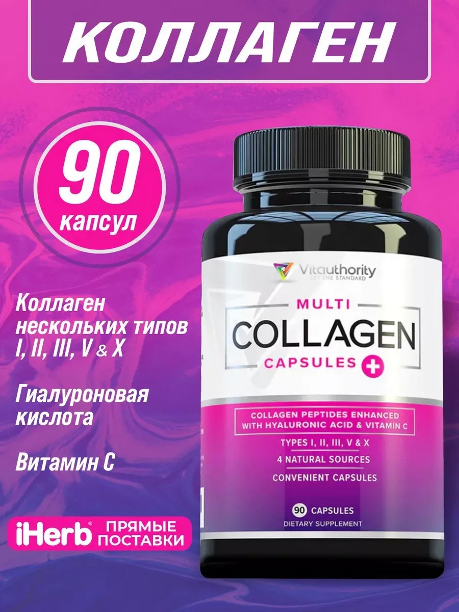 Составмультиколлагеновая смесь 5 типов (типы I, II, III, V и X), гиалуроновая кислота витамин с