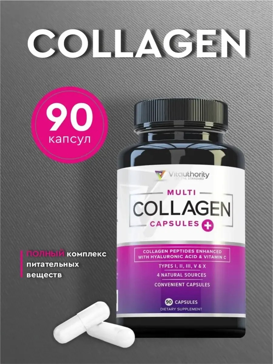 Витамины Vitauthority мульти Коллаген - содержит 5 типов пептидов коллагена премиум-класса в быстро усваивающихся капсулах,а также гиалуроновую кислоту и витамин C, которые работают на клеточном уровне, помогая поддерживать здоровье костей, суставов и пищеварения, придавая волосам, коже и ногтям молодой вид.Витаминный комплекс объединяет 5-коллагеновые пептиды в эффективную смесь 100% говядины, курицы, яичной скорлупы и морских источников коллагена, включая коллаген I, II, III, V и X типов для получения максимальной выгоды. Доказано, что коллаген типов I, III и V помогает уменьшить целлюлит и морщины, поддерживая эластичность кожи и увлажнение. Здоровье суставов и костей:Коллаген типов II и X поддерживает кости, сухожилия и соединительную ткань, делая суставы более здоровыми и безболезненными. Рекомендовано принимать по 3 капсулы в день.