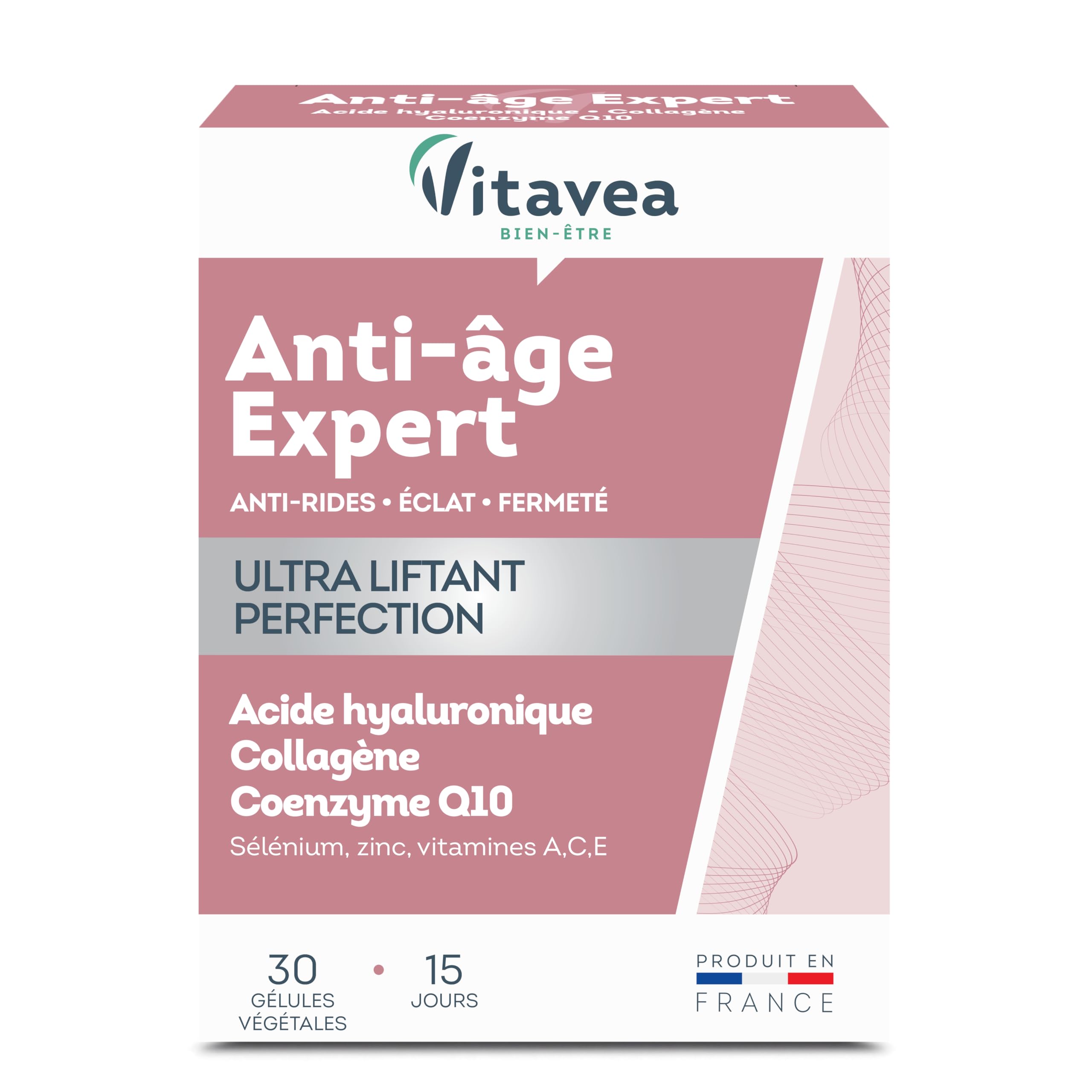 : VITAVEA WELL-BEING EXPERT ANTI-AGING formula is your ally in restoring radiance to your skin. This food supplement, enriched with hyaluronic acid, collagen, coenzyme Q10, vitamins A, C, E, zinc, and selenium, helps improve radiance and firmness and reduce wrinkles. Ingredients: Maltodextrin vegetable capsule (cellulose derivative) vitamin C fish collagen hydrolysate sodium hyaluronate vitamin E coenzyme Q10 mineral: zinc oxide anti-caking agent: magnesium salts of fatty acids selenium yeast (Saccharomyces cerevisiae) vitamin A. Take 2 capsules daily in the morning with a glass of water. Do not exceed the recommended dose. Consume as part of a varied and balanced diet and a healthy lifestyle. Store in a cool, dry place. Keep out of reach of children. Do not consume at the same time as other products containing vitamin A. Consumption should be limited to a few weeks months. Ingredients: Maltodextrin, vegetable-based capsule (cellulose derivative), vitamin C, fish collagen hydrolysate, sodium hyaluronate, vitamin E, coenzyme Q10, zinc oxide, anti-caking agent (magnesium salts of fatty acids), selenium yeast (Saccharomyces cerevisiae), vitamin AMADE IN FRANCE: Vitavea's anti-wrinkle food supplement, based on hyaluronic acid, collagen, and coenzyme Q10, is made in France and GMP (Good Manufacturing Practices) certified, guaranteeing quality and adherence to manufacturing processes. USAGE: The recommended dosage of Vitavea's anti-aging lifting food supplement, based on hyaluronic acid, collagen, and coenzyme Q10, is 2 capsules per day in the morning with a glass of water. Use as a course of treatment or throughout the year. This pack contains 30 capsules, a 15-day course. 8 STAR ANTI-AGING ACTIVE INGREDIENTS: Vitavea's anti-aging food supplement contains hyaluronic acid, collagen, coenzyme Q10, vitamins A, C, and E, zinc, and selenium. The combination of these 8 star active ingredients helps maintain nourished and radiant skin, contributes to skin firmness, keeps skin smooth, and reduces the appearance of wrinkles and fine lines. ANTI-WRINKLE, FIRMING, LIFTING: Vitavea's anti-aging food supplement combines a cocktail of active ingredients selected for their ultra-lifting action, including hyaluronic acid, collagen, and coenzyme Q10. These active ingredients are recognized and acclaimed for their anti-aging, anti-wrinkle, and lifting effects. They promote radiant, hydrated, and firm skin. ANTI-AGING FOOD SUPPLEMENT: Vitavea's anti-wrinkle lifting food supplement is your ally in restoring radiance to your skin. Its complete formula combines eight active ingredients recognized and acclaimed for their effectiveness on radiance, firmness, and wrinkles: hyaluronic acid, collagen, coenzyme Q10, vitamins A, C, and E, zinc, and selenium.Description du produit La formule ANTI-ÂGE EXPERT VITAVEA BIEN-ÊTRE est votre alliée pour redonner tout son éclat à la peau. Ce complément alimentaire, enrichi en acide hyaluronique, collagène, coenzyme Q10, vitamines A, C, E, zinc et sélénium, aide à améliorer l'éclat, la fermeté et à réduire les rides. Maltodextrine gélule d'origine végétale (dérivé de cellulose) vitamine C hydrolysat de collagène de poisson hyaluronate de sodium vitamine E coenzyme Q10 minéral : oxyde de zinc anti-agglomérant : sels de magnésium d'acides gras levure séléniée (Saccharomyces cerevisiae) vitamine A. 2 gélules par jour le matin, à avaler avec un verre d'eau. Ne pas dépasser la dose recommandée. À consommer dans le cadre d'une alimentation variée et équilibrée et d'un mode de vie sain. À conserver dans un endroit sec et frais. Garder hors de portée des enfants. Ne pas consommer en même temps d'autres produits contenant de la vitamine A. La consommation doit être limitée à quelques semaines mois. Ingrédients Maltodextrine, gelule d'origine vegetale (derive de cellulose), vitamine C, hydrolysat de collagene de POISSON, hyaluronate de sodium, vitamine E, coenzyme Q10, mineral oxyde de zinc, anti-agglomerant sels de magnesium d'acides gras, levure seleniee (Saccharomyces cerevisiae), vitamine AFABRICATION FRANCAISE : Le complément alimentaire anti ride Vitavea à base d'acide hyaluronique, collagène et coenzyme Q10 est fabriqué en France et certifié BPF (Bonnes Pratiques de Fabrication), vous garantissant qualité et respect des processus de fabrication. UTILISATION : La préconisation du complément alimentaire liftant anti âge Vitavea à base d'acide hyaluronique, collagène et coenzyme Q10 est de 2 gélules par jour le matin, avec un verre d'eau A utiliser en cure ou tout au long de l'année Ce pack contient 30 gélules soit une cure de 15 jours. 8 ACTIFS ANTI-AGE STAR : Le complément alimentaire anti âge Vitavea contient de l'acide hyaluronique, du collagène, du coenzyme Q10, des vitamines A, C, E, du zinc et du sélénium La combinaison de ses 8 actifs star permet de maintenir une peau nourrie et éclatante, contribuer à la fermeté de la peau, maintenir une peau lisse et diminuer les rides et ridules. ANTI RIDE, FERMETE, LIFTANT : Le complément alimentaire anti âge Vitavea associe un cocktail d'actifs sélectionnés pour leur action ultra liftante dont l'acide hyaluronique, le collagène, la coenzyme Q10 Ces actifs sont reconnus et plébiscités pour leurs effets anti âge, ant ride et liftant Ils favorisent une peau éclatante, hydratée et ferme. COMPLEMENT ALIMENTAIRE ANTI ÂGE : Le complément alimentaire anti ride liftant Vitavea est votre allié pour redonner tout son éclat à la peau. Sa formule complète associe 8 actifs reconnus et plébiscités pour leur efficacité sur l'éclat, la fermeté et les rides que sont l'acide hyaluronique, le collagène la coenzyme Q10, les vitamines A, C, E, le zinc, le sélénium.Vitavea - Anti Age Rides Expert Ultra Liftant - Complément Alimentaire Eclat, Fermeté - Acide Hyaluronique, Collagène, Coenzyme Q10, Zinc - 30 gélules - Cure de 15 jours - Fabriqué en France Format 30 gélules