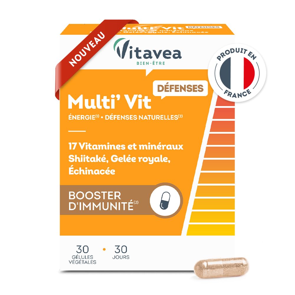 The VITAVEA Well-being Multi'Vit Defenses formula is your ally to boost your immunity. Multi'Vit Defenses VITAVEA Well-being is a food supplement. Its formula combines shiitake, royal jelly, echinacea and 19 vitamins and minerals to help strengthen your immunity and regain daily energy. INGREDIENTS Mineral: magnesium oxide vitamin C capsule of plant origin (cellulose derivative) mineral: iron bisglycinate shitake extract (Lentinula edodes) echinacea extract (Echinacea purpurea) selenated yeast (Saccharomyces cerevisiae) freeze-dried royal jelly vitamin B3 bulking agent: cellulose anti-caking agent: magnesium salts of fatty acids vitamins: B5, D minerals: manganese sulfate, chromium picolinate, potassium iodide, sodium molybdate vitamins: B12, B6, B2, B1, B9, B8. DIRECTIONS FOR USE 1 capsule per day in the morning, to swallow with a glass of water. SAFETY WARNING Do not exceed the recommended dose. To be consumed as part of a varied and balanced diet and a healthy lifestyle. Keep out of reach of children. Not recommended for people suffering from illnesses resulting in abnormal iron accumulation. Prolonged use not recommended. Not recommended for people suffering from thyroid disorders. Not suitable for people with allergies. FRENCH MANUFACTURE: The Vitavea Multi'vit Défenses food supplement based on 17 multivitamins and minerals (vitamin C, vitamin D, vitamins B6, B12), shiitake, royal jelly and echinacea is made in France, guaranteeing you quality and compliance with manufacturing processes. USE: This Vitavea Multi'vit Défenses food supplement based on multivitamins and minerals (vitamin C, vitamin D, vitamins B6, B12), shiitake, royal jelly and echinacea is ideal for boosting your immunity. Take 1 capsule per day in the morning, at mealtime, to be swallowed with a glass of water. This pack contains 30 capsules, i.e. a 30-day course. UNIQUE COMBINATION - VITAMINS AND MINERALS, SHIITAKE AND ROYAL JELLY: The formula of our food supplement combines recognized and unique active ingredients: 17 multivitamins and minerals, shiitake, royal jelly and echinacea. Vitamins B1, B2, B3, B5, B6, B8, B9, B12, vitamin C, vitamin D, iron, manganese contribute to the proper functioning of the immune system and helps boost energy. DOUBLE ACTION FORMULA: The formula of our Vitavea Multi'vit Defenses food supplement has a double action on energy and natural defenses. The innovative combination of 17 vitamins and minerals, shiitake, royal jelly and echinacea is an advantage to boost your immune system and regain energy. FOOD SUPPLEMENT TO BOOST IMMUNITY: Our Vitavea Multi'vit Defenses food supplement is your ally to boost your immunity. Its complete and unique formula based on 17 vitamins and minerals, shiitake, royal jelly and echinacea helps strengthen your immunity and regain energy every day. La formule Multi'Vit Défenses VITAVEA Bien-être est votre alliée pour booster votre immunité. Multi'Vit Défenses VITAVEA Bien-être est un complément alimentaire. Sa formule associe shiitaké, gelée royale, échinacée et 19 vitamines et minéraux pour aider à renforcer votre immunité et retrouver de l'énergie au quotidien. INGRÉDIENTS Minéral : oxyde de magnésium vitamine C gélule d'origine végétale (dérivé de cellulose) minéral : bisglycinate de fer extrait de shitaké (Lentinula edodes) extrait d'échinacée (Echinacea purpurea) levure séléniée (Saccharomyces cerevisiae) gelée royale lyophilisée vitamine B3 agent de charge : cellulose anti-agglomérant : sels de magnésium d'acide gras vitamines : B5, D minéraux : sulfate de manganèse, picolinate de chrome, iodure de potassium, molybdate de sodium vitamines : B12, B6, B2, B1, B9, B8. MODE D'EMPLOI 1 gélule par jour le matin, à avaler avec un verre d'eau. AVERTISSEMENT DE SÛRETÉ Ne pas dépasser la dose recommandée. À consommer dans le cadre d'une alimentation variée et équilibrée et d'un mode de vie sain. Garder hors de portée des enfants. Déconseillé aux personnes souffrant de maladies ayant pour conséquence une accumulation anormale de fer. Usage prolongé déconseillé. Déconseillé aux personnes souffrant de troubles de la thyroïde. Ne convient pas aux personnes ayant un terrain allergique. FABRICATION FRANCAISE : Le complément alimentaire Multi'vit Défenses Vitavea à base de 17 multivitamines et minéraux (vitamine C, vitamine D, vitamines B6, B12), shiitaké, gelée royale et échinacée est fabriqué en France, vous garantissant qualité et respect des processus de fabrication. UTILISATION : Ce complément alimentaire Multi'vit Défenses Vitavea à base de multivitamines et minéraux (vitamine C, vitamine D, vitamines B6, B12), shiitaké, gelée royale et échinacée est idéal pour booster votre immunité. Prendre 1 gélule par jour le matin, au moment du repas, à avaler avec un verre d'eau. Ce pack contient 30 gélules soit une cure de 30 jours. ASSOCIATION INÉDITE - VITAMINES ET MINÉRAUX, SHIITAKÉ ET GELÉE ROYALE : La formule de notre complément alimentaire associe des actifs reconnus et inédits : 17 multivitamines et minéraux, shiitakée, gelée royale et échinacée. Les vitamines B1, B2, B3, B5, B6, B8, B9, B12, vitamine C, vitamine D, Fer, Manganèse contribuent au bon fonctionnement du système immunitaire et permet de booster l'énergie. FORMULE DOUBLE ACTION : La formule de notre complément alimentaire Multi'vit Défenses Vitavea a une doucle action sur l'énergie et les défenses naturelles. L'association innovante de 17 vitamines et minéraux, shiitaké, gelée royale et échinacée constitue un avantage pour booster votre système immunitaire et retrouver de l'énergie. COMPLEMENT ALIMENTAIRE POUR BOOSTER L'IMMUNITÉ : Notre complément alimentaire Multi'vit Défenses Vitavea est votre allié pour booster votre immunité. Sa formule complète et inédite à base 17 vitamines et minéraux, shiitaké, gelée royale et échinacée permet de renforcer votre immunité et retrouver de l'énergie