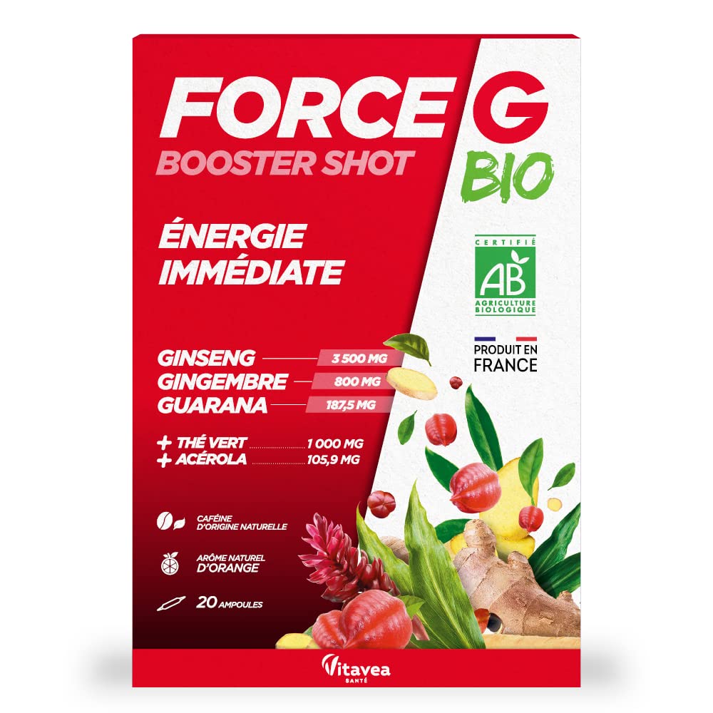 Ingredients Water aqueous extract of ginseng (Panax ginseng) aqueous extract of green tea (Camellia sinensis) aqueous extract of ginger (Zingiber officinale) agave syrup concentrated orange juice dry extract of guarana (Paulinia cupana) acerola juice powder titrated in vitamin C natural orange flavor natural caffeine . Ingredients from organic farming Safety Warning Do not exceed the recommended dose. To be consumed as part of a varied, balanced diet and a healthy lifestyle. Reserved for adults. Contains caffeine (32 mg day), not recommended for children, adolescents and pregnant and breastfeeding women. Use in people under antidiabetic treatment is not recommended. Keep out of reach of children. Ingredients Water aqueous extract of ginseng (Panax ginseng) aqueous extract of green tea (Camellia sinensis) aqueous extract of ginger (Zingiber officinale) agave syrup concentrated orange juice dry extract of guarana (Paulinia cupana) acerola juice powder titrated in vitamin C natural orange flavor natural caffeine . Ingredients from organic farming Safety Warning Do not exceed the recommended dose. To be consumed as part of a varied, balanced diet and a healthy lifestyle. Reserved for adults. Contains caffeine (32 mg day), not recommended for children, adolescents and pregnant and breastfeeding women. Use in people under antidiabetic treatment is not recommended. Keep out of reach of children. INGREDIENTS Water aqueous extract of ginseng (Panax ginseng) aqueous extract of green tea (Camellia sinensis) aqueous extract of ginger (Zingiber officinale) agave syrup concentrated orange juice dry extract of guarana (Paulinia cupana) acerola juice powder titrated in vitamin C natural orange flavor natural caffeine . Ingredients from organic farming SAFETY WARNING Do not exceed the recommended dose. To be consumed as part of a varied, balanced diet and a healthy lifestyle. Reserved for adults. Contains caffeine (32 mg day), not recommended for children, adolescents and pregnant and breastfeeding women. Use in people under antidiabetic treatment is not recommended. Keep out of reach of children. FRENCH MANUFACTURE: The Force G Booster Shot BIO food supplement based on Ginseng, Guarana, Ginger, Green Tea and Vitamin C is manufactured in our laboratories in Vendée in compliance with best practices. USE: 1 ampoule per day, diluted in a glass of water provides energy, vitality and tone on a daily basis. This pack contains 20 ampoules, for a 20-day course. 100 NATURAL AND ORGANIC FORMULA: Force G Booster Shot BIO is composed of 3 active ingredients of natural origin and known to restore energy and vivacity: ginseng, ginger and guarana. Green tea and acerola, naturally rich in vitamin C, perfectly complement the formula for effective action. IMMEDIATE ENERGY: Force G Booster Shot BIO provides a concentrate of active ingredients to restore energy. This fast-acting energy booster helps reduce fatigue, support mental alertness, balance the body and maintain the immune system. ENERGY FOOD SUPPLEMENT: Force G Booster Shot ORGANIC is the complete solution composed of 5 natural active ingredients to regain energy: ginseng, ginger, guarana, green tea and acerola. This energy booster based on natural ingredients is ideal for quickly regaining energy in case of temporary fatigue, in winter or during seasonal changes. Ingrédients Eau extrait aqueux de ginseng (Panax ginseng) extrait aqueux de thé vert (Camellia sinensis) extrait aqueux de gingembre (Zingiber officinale) sirop d'agave jus concentré d'orange extrait sec de guarana (Paulinia cupana) poudre de jus d'acérola titré en vitamine C arôme naturel d'orange caféine naturelle . Ingrédients issus de l'agriculture biologique Avertissement De Sûreté Ne pas dépasser la dose recommandée. A consommer dans le cadre d'une alimentation variée, équilibrée et d'un mode de vie sain. Réservé à l'adulte. Contient de la caféine (32 mg jour), déconseillé aux enfants, aux adolescents et aux femmes enceintes et allaitantes. L'emploi chez les personnes sous traitement antidiabétique est déconseillé. À garder hors de portée des enfants. Ingrédients Eau extrait aqueux de ginseng (Panax ginseng) extrait aqueux de thé vert (Camellia sinensis) extrait aqueux de gingembre (Zingiber officinale) sirop d'agave jus concentré d'orange extrait sec de guarana (Paulinia cupana) poudre de jus d'acérola titré en vitamine C arôme naturel d'orange caféine naturelle . Ingrédients issus de l'agriculture biologique Avertissement De Sûreté Ne pas dépasser la dose recommandée. A consommer dans le cadre d'une alimentation variée, équilibrée et d'un mode de vie sain. Réservé à l'adulte. Contient de la caféine (32 mg jour), déconseillé aux enfants, aux adolescents et aux femmes enceintes et allaitantes. L'emploi chez les personnes sous traitement antidiabétique est déconseillé. À garder hors de portée des enfants. INGRÉDIENTS Eau extrait aqueux de ginseng (Panax ginseng) extrait aqueux de thé vert (Camellia sinensis) extrait aqueux de gingembre (Zingiber officinale) sirop d'agave jus concentré d'orange extrait sec de guarana (Paulinia cupana) poudre de jus d'acérola titré en vitamine C arôme naturel d'orange caféine naturelle . Ingrédients issus de l'agriculture biologique AVERTISSEMENT DE SÛRETÉ Ne pas dépasser la dose recommandée. A consommer dans le cadre d'une alimentation variée, équilibrée et d'un mode de vie sain. Réservé à l'adulte. Contient de la caféine (32 mg jour), déconseillé aux enfants, aux adolescents et aux femmes enceintes et allaitantes. L'emploi chez les personnes sous traitement antidiabétique est déconseillé. À garder hors de portée des enfants. FABRICATION FRANCAISE : Le complément alimentaire Force G Booster Shot BIO à base de Ginseng, Guarana, Gingembre, The vert et Vitamine C est fabriqué dans nos laboratoires en Vendée dans le respect des bonnes pratiques. UTILISATION : 1 ampoule par jour, diluée dan
