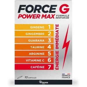 Ingredients Water concentrated orange juice fructose argigine vitamin C dry extract of guarana (Paulinia cupana) titrated at 10 caffeine taurine dry extract of ginseng (Panax ginseng) caffeine aqueous extract of ginger (Zingiber officinale) orange flavor. Instructions for use 1 ampoule per day, diluted in 1 2 glass of water or fruit juice, for 10 days. Can be renewed as often as necessary. Safety Warning Do not exceed the recommended dose. To be consumed as part of a varied, balanced diet and a healthy lifestyle. Contains caffeine (80 mg day), not recommended for children and pregnant women. Use in people under antidiabetic treatment is not recommended. Keep out of reach of children. INGREDIENTS Water concentrated orange juice fructose argigine vitamin C dry extract of guarana (Paulinia cupana) titrated at 10 caffeine taurine dry extract of ginseng (Panax ginseng) caffeine aqueous extract of ginger (Zingiber officinale) orange flavor. DIRECTIONS FOR USE 1 ampoule per day, diluted in 1 2 glass of water or fruit juice, for 10 days. Can be renewed as often as necessary. SAFETY WARNING Do not exceed the recommended dose. To be consumed as part of a varied, balanced diet and a healthy lifestyle. Contains caffeine (80 mg day), not recommended for children and pregnant women. Use in people under antidiabetic treatment is not recommended. Keep out of reach of children. FRENCH MANUFACTURE: The Force G Power Max food supplement Reinforced formula based on Ginseng, Ginger, Guarana, Taurine, Arginine, Vitamin C and Caffeine is manufactured in our laboratories in Vendée in compliance with good practices. USE: 1 ampoule per day of Force G Power Max based on ginseng, ginger, guarana, taurine, arginine, vitamin C and caffeine diluted in 1 2 glass of water or fruit juice to quickly regain energy, vitality and tone. This pack contains 10 ampoules, for a 10-day course. REINFORCED FORMULA: Force G Power Max is composed of 7 active ingredients known to restore energy and liveliness: ginseng, ginger and guarana. The addition of taurine, arginine and caffeine ideally completes this formula and makes it the ideal booster to quickly regain energy. IMMEDIATE ENERGY: Force G Power Max provides a concentrate of 7 active ingredients to quickly regain energy. This fast-acting energy booster helps reduce fatigue, support intellectual alertness, balance the body and maintain the immune system. IMMEDIATE ENERGY BOOSTER: Force G Power Max is the complete solution composed of 7 natural active ingredients in a reinforced formula to quickly regain energy: ginseng, ginger, guarana, taurine, arginine, Vitamin C, Caffeine. This dietary supplement is ideal for boosting your body and providing an immediate response to temporary fatigue, in winter or during seasonal changes. Ingrédients Eau jus concentré d'orange fructose argigine vitamine C extrait sec de guarana (Paulinia cupana) titré à 10 en caféine taurine extrait sec de ginseng (Panax ginseng) caféine extrait aqueux de gingembre (Zingiber officinale) arôme orange. Mode d'emploi 1 ampoule par jour, diluée dans 1 2 verre d'eau ou de jus de fruits, pendant 10 jours. Peut être renouvelé aussi souvent que nécessaire. Avertissement De Sûreté Ne pas dépasser la dose recommandée. A consommer dans le cadre d'une alimentation variée, équilibrée et d'un mode de vie sain. Contient de la caféine (80 mg jour), déconseillé aux enfants et aux femmes enceintes. L'emploi chez les personnes sous traitement antidiabétique est déconseillé. À garder hors de portée des enfants. INGRÉDIENTS Eau jus concentré d'orange fructose argigine vitamine C extrait sec de guarana (Paulinia cupana) titré à 10 en caféine taurine extrait sec de ginseng (Panax ginseng) caféine extrait aqueux de gingembre (Zingiber officinale) arôme orange. MODE D'EMPLOI 1 ampoule par jour, diluée dans 1 2 verre d'eau ou de jus de fruits, pendant 10 jours. Peut être renouvelé aussi souvent que nécessaire. AVERTISSEMENT DE SÛRETÉ Ne pas dépasser la dose recommandée. A consommer dans le cadre d'une alimentation variée, équilibrée et d'un mode de vie sain. Contient de la caféine (80 mg jour), déconseillé aux enfants et aux femmes enceintes. L'emploi chez les personnes sous traitement antidiabétique est déconseillé. À garder hors de portée des enfants. FABRICATION FRANCAISE : Le complément alimentaire Force G Power Max Formule renforcée à base de Ginseng, Gingembre, Guarana, Taurine, Arginine, Vitamine C et Caféine est fabriqué dans nos laboratoires en Vendée dans le respect des bonnes pratiques. UTILISATION : 1 ampoule par jour de Force G Power MAx à base de ginseng, gingembre, guarana, taurine, arginine, vitamine C et caféine diluée dans 1 2 verre d'eau ou de jus de fruit pour retrouver énergie, vitalité et tonus rapidement. Ce pack contient 10 ampoules, pour une cure de 10 jours. FORMULE RENFORCEE : Force G Power Max est composé de 7 actifs reconnus pour retrouver de l'énergie et de la vivacité : le ginseng, le gingembre et le guarana. L'ajout de la taurine, de l'arginine et de la caféine complète idéalement cette formule et en fait le booster odéal pour retrouver de l'énergie rapidement. ENERGIE IMMEDIATE : Force G Power Max apporte un concentré de 7 actifs pour retrouver de l'énergie rapidement. Ce booster d'énergie à action rapide participe à la réduction de la fatigue, au soutien de la vivacité intellectuelle, à l'équilibre de l'organisme et au maintien du système immunitaire. BOOSTER ENERGIE IMMEDIATE : Force G Power Max est la solution complète composée de 7 actifs d'origine naturelle dans une formule renforcée pour retrouver de l'énergie rapidement : ginseng, gingembre, guarana, taurine, arginine, Vitamine C, Caféine. Ce complément alimentaire est idéal pour booster votre organisme et apporter une réponse immédiate à la fatigue passagère, en hiver ou lors des changements de saison.