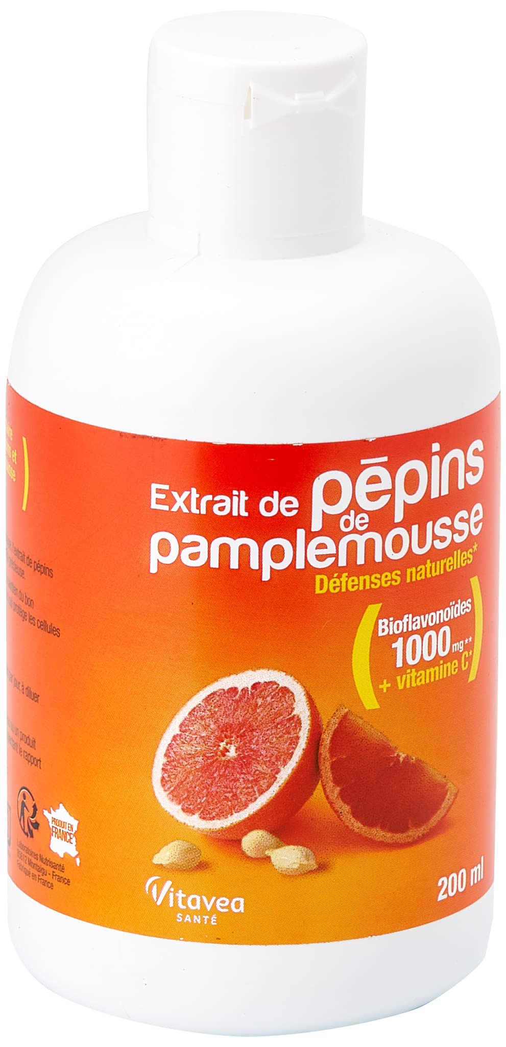 GRAPEFRUIT SEED EXTRACT Our formula combines grapefruit seed extract, better known as EPP from citrus paradisi, with vitamin C. If EPP provides its protective action thanks to the bioflavonoids it contains, vitamin C strengthens the immune system. Use This food supplement can be used internally: 7 to 15 drops morning, noon and evening, diluted in a glass of water or for external use with water or a hygiene product (shampoo, toothpaste, etc.) at a rate of 2 drops per ml. When to use it? It is particularly recommended during the changing seasons or at the arrival of winter in order to support the body against winter ailments (colds, coughs, etc.). For the record We owe the discovery of grapefruit seed extract to scientist Jacob Harish. Passionate about gardening, he noticed that no bacteria grew on his compost when it was covered with grapefruit seeds. Today, some farmers still use grapefruit seed against pests (aphids, slugs, etc.) and fungi. It is also regularly recommended in Do It Yourself cosmetic recipes to serve as a natural preservative. For 40 drops ( 2ml): Vitamin C: 60 mg (75 VNR ) Grapefruit seed and pulp extract: 44.46 mg including bioflavonoids: 20 mg Nutritional Reference Values For internal use: 20 and 40 drops per day to be distributed morning, noon and evening to be diluted in a glass of water or fruit juice. For external use: mix with water or a hygiene product (shampoo, toothpaste, etc.) respecting the ratio of 2 drops per ml. Do not exceed the recommended daily dose. To be consumed as part of a varied, balanced diet and a healthy lifestyle. Shake before use. Keep out of reach of children. About the Vitavea brand, specialist in natural well-being, offers you a wide range of products to take care of you. We are committed to supporting you in your well-being process and allowing you to find the food supplement that meets your needs. Accessible to all, easy to use, our products fit ideally into your daily life. All our food supplements are made in France and GMP (Good Manufacturing Practices) certified, guaranteeing quality and respect for manufacturing processes. With Vitavea, well-being and health are within reach! INGREDIENTS Stabilizer: glycerin water vitamin C grapefruit seed and pulp extract (Citrus x paradisi) DIRECTIONS FOR USE For internal use: 20 and 40 drops per day distributed morning, noon and evening to be diluted in a glass of water or fruit juice. For external use: mix with water or a hygiene product (shampoo, toothpaste, etc.) respecting the ratio of 2 drops per ml. SAFETY WARNING Do not exceed the recommended daily dose. To be consumed as part of a varied, balanced diet and a healthy lifestyle. Shake before use. Keep out of reach of children. FRENCH MANUFACTURE: This Vitavea Grapefruit Seed Extract food supplement is made in France in compliance with manufacturing and quality processes. EASY TO USE: The dosage of Grapefruit Seed Extract Vitamin C is 10 to 20 drops per day to be diluted in a glass of water (ratio of 2 drops per ml of water). Its use is facilitated thanks to the included dropper. 200 ml bottle, i.e. 200 days of treatment. VITAMIN C EPP - DUO STAR: Vitavea Grapefruit Seed Extract Vitamin C offers a complete formula to help maintain a healthy immune system. Its formula contains a large amount of EPP, rich in flavonoids, traditionally used for its immunostimulant and antioxidant properties. Concerned about the quality of our formula, this one contains controlled Citrus paradisi extract, originating from Spain where this fruit is naturally present - 100 ml contains 2223 mg of EPP. Our EPP is obtained by aqueous extraction to guarantee a formula without alcohol or chemical solvents. Enriched with vitamin C, this product is a formidable immunity boost. BOOST YOUR NATURAL DEFENSES: This product contains a large quantity of grapefruit seed extract (GSE) and vitamin C, it is highly concentrated in bioflavonoids, used in traditional medicine for immunity and against oxidative stress. 100 ml of our vitamin and EPP formula contains 1,000 mg of bioflavonoids, precisely dosed using the HPLC technique. Its safe and controlled formula allows it to be given to children from 6 years old. It is therefore an ideal ally suitable for the whole family. IMMUNITY BOOST: Vitavea Grapefruit Seed Extract Vitamin C gives you an immune system boost thanks to its high concentration of EPP (grapefruit seed extract) and vitamin C. It is a valuable ally for maintaining immune systems. EXTRAIT DE PÉPINS DE PAMPLEMOUSSE Notre formule allie l'extrait de pépins de pamplemousse, plus connu sous le nom d'EPP du citrus paradisi, à la vitamine C. Si l'EPP apporte son action protectrice grâce aux bioflavonoïdes qu'il contient, la vitamine C quant à elle renforce les défenses immunitaires. Usage Ce complément alimentaire peut s'utiliser en usage interne : 7 à 15 gouttes matin, midi et soir, à diluer dans un verre d'eau ou en usage externe avec de l'eau ou un produit d'hygiène (shampooing, dentifrice…) à raison de 2 gouttes par ml. Quand l'utiliser ? Il est particulièrement recommandé lors des changements de saisons ou à l'arrivée de l'hiver afin de soutenir l'organisme contre les maux de l'hiver (rhume, toux, …). Pour la petite histoire On doit la découverte de l'extrait de pépins de pamplemousse au scientifique Jacob Harish. Passionné de jardinage, il avait constaté qu'aucune bactérie ne se développait sur son compost lorsque celui-ci était recouvert par des pépins de pamplemousse. Aujourd'hui, certain agriculteurs utilisent encore du pépin de pamplemousse contre les nuisibles (pucerons, limaces.) et les champignons. Il est aussi régulièrement conseillé dans des recettes de Do It Yourself cosmétique pour servir de conservateur naturel.Pour 40 gouttes ( 2ml) : Vitamine C : 60 mg (75 VNR ) Extrait de pépins et de pulpe de pamplemousse : 44,46 mg dont bioflavonoïdes : 20 mg Valeurs Nutritionnelles de Référence En usage interne : 20 et 40 gouttes par