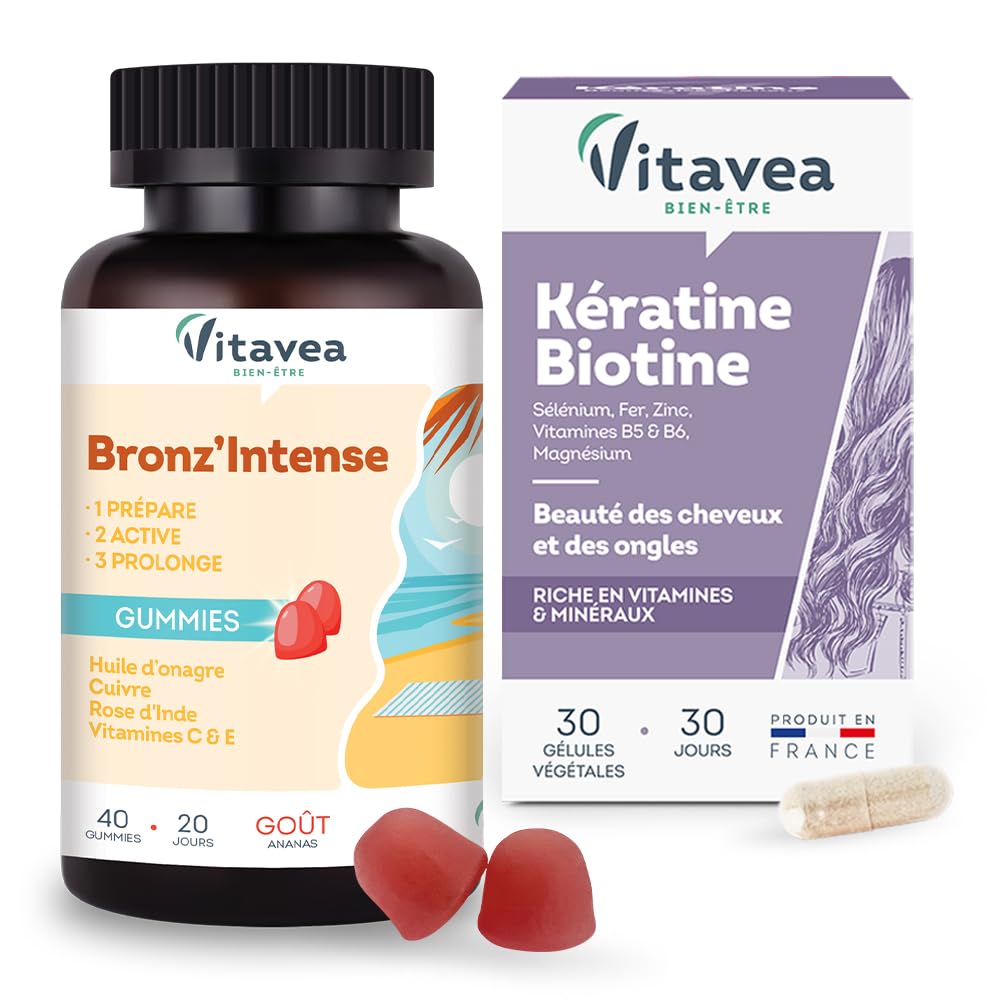 PREPARE, ACTIVATE, AND PROLONG YOUR TAN: Our tanning supplement offers a triple-action formula: it prepares your skin for the sun, activates and prolongs your tan, while preserving your skin's beauty. An exclusive formula for a radiant, sun-kissed complexion and nourished skin. TAN SUPPLEMENT: Our Bronz'Intense gummies are your ally to prepare your skin for the sun and activate your tan when the warmer weather arrives! Our complete triple-action formula helps you prepare, activate, and prolong your tan. TOP-NOTCH HAIR: The secret of our Vitavea hair care supplement. Its formula contains recognized and acclaimed active ingredients to promote beautiful hair and nails. It contains keratin, B vitamins, including biotin (vitamin B8), and carefully selected minerals such as zinc and selenium. Together, these active ingredients have an optimal effect on the beauty and vitality of hair and nails. BEAUTY AND STRENGTH SUPPLEMENT FOR HAIR AND NAILS: Vitavea hair care supplement contains well-known and popular active ingredients to promote beautiful hair and nails. Its unique formula is composed of 6 nutrients, including keratin, biotin (vitamin B8), zinc, iron, and selenium. A concentrated dose of effectiveness. SUN GUMMIES KERATIN BIOTIN: The Bronz'Intense Sun Gummies Keratin Biotin combination combines gummies to prepare, activate, and prolong your tan with a dietary supplement to strengthen hair and nails thanks to keratin and biotin. This duo helps prepare your skin and enhance your tan while promoting beautiful hair and nails.