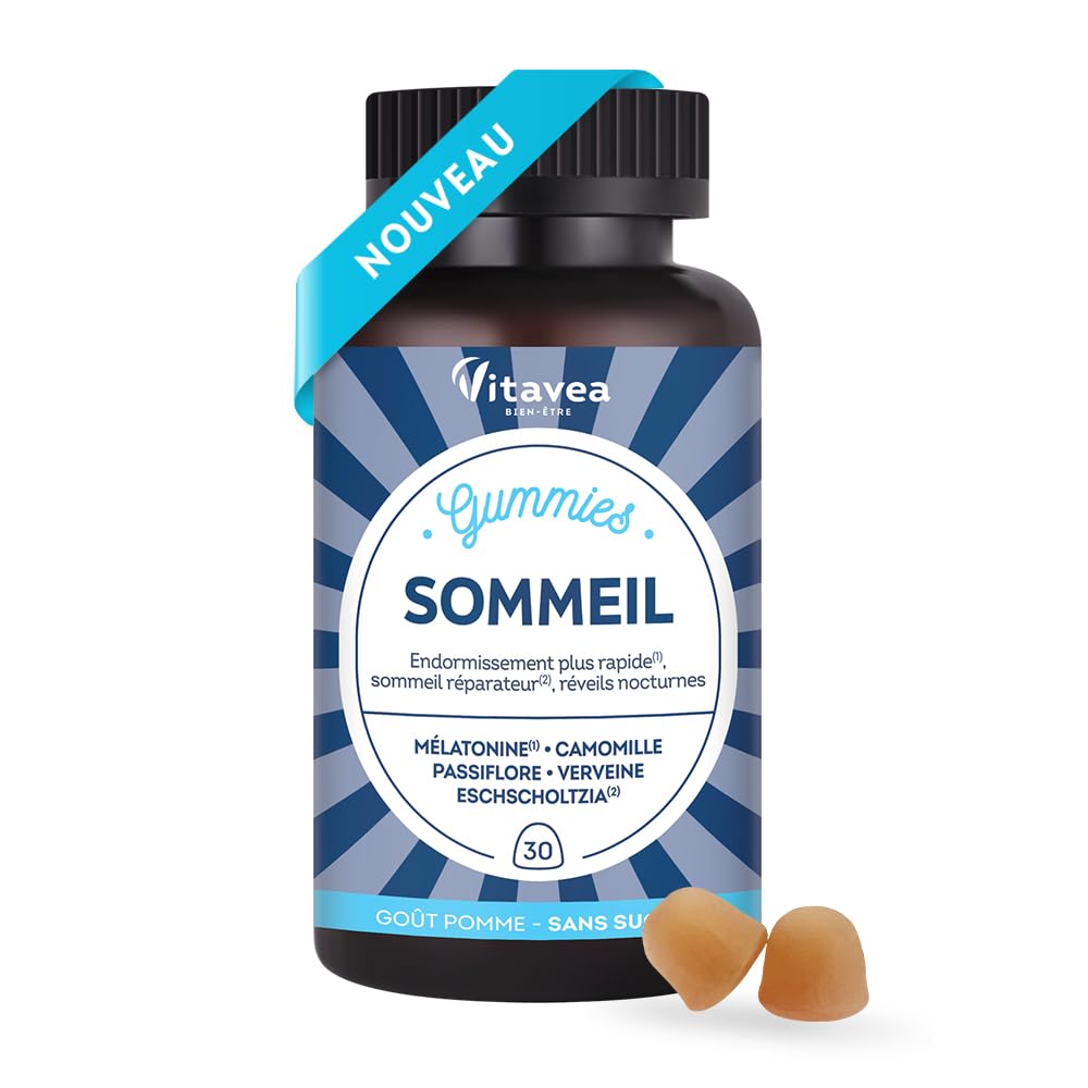 : VITAVEA WELL-BEING SLEEP GUMMIES are your ally for faster, more restful sleep. This food supplement, enriched with 1mg of melatonin, as well as chamomile, passionflower, verbena, and California poppy, helps reduce the time it takes to fall asleep, contributes to the quality of natural sleep, and limits nighttime awakenings. A complete, sugar-free, and non-habit-forming formula with a delicious apple flavor. Ingredients: Sweeteners: maltitol, sorbitol water gelling agent: pectins acid: citric acid California poppy extract (Eschscholzia californica) chamomile extract (Matricaria recutita) passionflower extract (Pasiflora incarnata) lemon verbena extract (Lippia citriodora) acidity regulator: sodium citrate vegetable oil (coconut) color: curcumin Natural flavor melatonin anti-caking agent: carnauba wax. Directions: Take 1 gummie per day, to dissolve on the tongue or chew, 30 minutes before bedtime. Safety Warning: Do not exceed the recommended dose. Consume as part of a varied and balanced diet and a healthy lifestyle. Keep out of reach of children. For adult use only. Contraindicated for children, adolescents, pregnant or breastfeeding women. In case of a specific medical condition or medication, consult your doctor before use. Not recommended for individuals who need to perform activities requiring sustained alertness and where drowsiness could pose a safety risk. Excessive consumption may have laxative effects. See moreDESIGNED IN FRANCE: The Sleep Gummies food supplement was designed in France, adhering to strict manufacturing and quality control processes. INNOVATIVE AND CONVENIENT FORMAT: Take 1 gummy daily, 30 minutes before bedtime. The beneficial effects of melatonin are felt with a daily intake of 1 mg, the dose contained in 1 Sleep gummy. Vitavea Adult Sleep Gummies are vegan and formulated without artificial flavors or colors, sugars, lactose, or gluten. These tasty gummies, with a delicious apple flavor, are non-habit forming. MELATONIN, CHAMOMILE, PASSIONFLOWER - THE SLEEP TRIO: Melatonin, often called the sleep hormone, is a molecule secreted by the brain and therefore naturally present in the body. Its role is to help the body regulate its sleep-wake cycle. Chamomile and passionflower are plants traditionally used for relaxation and to improve sleep. Thanks to the combination of these 3 active ingredients, Sleep Gummies help you fall asleep faster. FAST SLEEP: The Sleep Gummies food supplement is your ally for faster, more restful sleep. This complex, based on melatonin and plants including chamomile, passionflower, and California poppy, helps improve the quality of natural sleep, reduces the time it takes to fall asleep, and limits nighttime awakenings. ADULT SLEEP FOOD SUPPLEMENT: Thanks to the combination of melatonin, chamomile, and passionflower—3 popular active ingredients for falling asleep and relaxation—Vitavea offers an innovative and ideal formula, non-habit forming, that helps facilitate falling asleep and promote quality sleep.Description du produit La formule GUMMIES SOMMEIL VITAVEA BIEN-ÊTRE est votre alliée pour un sommeil plus rapide et réparateur. Ce complément alimentaire, enrichi de 1mg de mélatonine, ainsi que de camomille, passiflore, verveine et eschscholtzia, aide à réduire le temps d'endormissement, contribue à la qualité du sommeil naturel et limite les réveils nocturnes. Une formule complète, sans sucres et sans accoutumance, avec une délicieuse saveur pomme. Ingrédients Édulcorants : maltitol, sorbitol eau gélifiant : pectines acidifiant : acide citrique extrait d'eschscholzia (Eschscholzia californica) extrait de camomille (Matricaria recutita) extrait de passiflore (Pasiflora incarnata) extrait de verveine (Lippia citriodora) correcteur d'acidité : citrate de sodium huile végétale (noix de coco) colorant : curcumine arôme naturel mélatonine anti-agglomérant : cire de carnauba. P.when('A').execute(function(A) { A.on('a:expander:toggle_description:toggle:collapse', function(data) { window.scroll(0, data.expander. expander[0].offsetTop-100) }) }) Mode d'emploi 1 gummie par jour, à faire fondre sur la langue ou à croquer, 30 minutes avant le coucher. Avertissement De Sûreté Ne pas dépasser la dose recommandée. À consommer dans le cadre d'une alimentation variée et équilibrée et d'un mode de vie sain. Garder hors de portée des enfants. Réservé à l'adulte. Contre-indiqué aux enfants, adolescents, femmes enceintes ou allaitantes. En cas de situation médicale particulière ou de traitement médicamenteux, demander conseil à votre médecin avant utilisation. Déconseillé aux personnes devant réaliser une activité nécessitant une vigilance soutenue et pouvant poser un problème de sécurité en cas de somnolence. Une consommation excessive peut avoir des effets laxatifs. Voir plusCONÇU EN FRANCE : Le complément alimentaire Gummies Sommeil a été conçu en France dans le respect des processus de fabrication et de qualité. FORMAT INNOVANT ET PRATIQUE : Prendre 1 gummy par jour, 30 minutes avant le coucher. Les effets bénéfiques de la mélatonine se font sentir avec une consommation journalière de 1 mg, soit la dose contenue dans 1 gummy Sommeil. Les Gummies Sommeil Adulte Vitavea sont vegan et formulés sans arôme ni colorant artificiels, sans sucres, sans lactose et sans gluten. Ces gummies savoureux, au bon goût de pomme, sont sans accoutumance. MELATONINE, CAMOMILLE, PASSIFLORE - LE TRIO SOMMEIL : La mélatonine, souvent qualifiée d'hormone du sommeil, est une molécule sécrétée par le cerveau, donc naturellement présente dans l'organisme. Son rôle est d'aider le corps à gérer son cycle veille sommeil. La camomille et la passiflore sont des plantes traditionnellement utilisées pour la relaxation et l'amélioration du sommeil. Grâce à l'association de ces 3 actifs, les gummies Sommeil permettent un endormissement plus rapide. ENDORMISSEMENT RAPIDE : Le complément alimentaire Gummies Somm