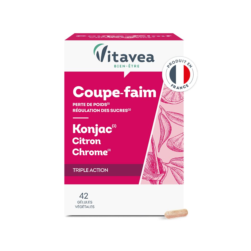 Appetite suppressant food supplement The Konjac Lemon Chrome VITAVEA Well-being formula is your appetite suppressant ally to promote weight loss. Konjac Lemon Chrome VITAVEA Well-being is a food supplement. Its concentrated konjac formula delivers a sufficient dose of glucomannan and thus contributes to weight loss while providing a satiety effect. Product Details Appetite suppressant helps: Contribute to weight loss (Konjac) Provide an effect of satiety (Konjac) Contribute to maintaining normal blood sugar levels (Chrome) About Vitavea Vitavea, specialist in natural well-being, offers you a wide range of products to take care of you. We are committed to supporting you in your well-being process and enabling you to find the product that meets your needs. Accessible to all, easy to use, our products fit ideally into your daily life. All our products are made in France, guaranteeing you quality and respect for manufacturing processes. With Vitavea, well-being and health are within reach! Ingredients Konjac extract (Amorphophallus konjac) capsule of plant origin (cellulose derivative) stabilizer: mono and diglycerides of fatty acids concentrated lemon juice powder (Citrus limon) anti-caking agent: magnesium salts of fatty acids mineral: chromium picolinate. Active content for 6 capsules Konjac extract: 3.57 g including glucomannan: 3 g Concentrated lemon juice powder: 120 mg Chromium: 20 µg (50 NRV ) NRV Nutritional Reference Values Directions for use 2 capsules to swallow 30 minutes before each of the 3 daily meals, with one or two large glasses of water. Precautions for use Do not exceed the recommended dose. To be consumed as part of a varied and balanced diet and a healthy lifestyle. Keep out of reach of children. Not recommended for people with difficulty swallowing or swallowing. Do not open the capsule before swallowing. Reserved for adults. INGREDIENTS Konjac extract (Amorphophallus konjac) capsule of plant origin (cellulose derivative) stabilizer: mono and diglycerides of fatty acids concentrated lemon juice powder (Citrus limon) anti-caking agent: magnesium salts of fatty acids mineral: chromium picolinate. DIRECTIONS FOR USE 2 capsules to swallow 30 minutes before each of the 3 daily meals, with one or two large glasses of water. SAFETY WARNING Do not exceed the recommended dose. To be consumed as part of a varied and balanced diet and a healthy lifestyle. Keep out of reach of children. Not recommended for people with difficulty swallowing or swallowing. Do not open the capsule before swallowing. Reserved for adults. MADE IN FRANCE: The Vitavea Appetite Suppressant food supplement is made in France in our laboratories in Vendée, in compliance with manufacturing and quality processes. USE: Take 2 capsules of our Appetite Suppressant food supplement, 30 minutes before each of the 3 daily meals with a large glass of water. This pack contains 42 capsules, or 7 days of slimming treatment. Developed by micronutrition experts, our Appetite Suppressant capsules are gluten-free, lactose-free, sugar-free, gelatin-free, and without artificial flavors or colors. KONJAC - STAR ACTIVE INGREDIENT: The formula of the Vitavea Appetite Suppressant food supplement contains konjac, which promotes weight loss and provides a satiety effect. Chromium, which contributes to the maintenance of normal blood sugar levels, ideally completes this slimming formula thanks to its sugar-regulating action. WEIGHT LOSS AND APPETITE SUPPRESSANT: This Vitavea slimming food supplement contains recognized and acclaimed active ingredients, konjac, chromium and lemon, to aid weight loss and promote the feeling of satiety. Its concentrated konjac formula delivers a sufficient dose of glucomannan and thus contributes to rapid and effective weight loss, while providing a satiety effect. ✓ APPETITE SUPPRESSANT FOOD SUPPLEMENT: The powerful and effective Vitavea appetite suppressant food supplement is your ally to facilitate weight loss. Its formula based on konjac, a star slimming active ingredient, lemon and chromium, supports you in your goal of rapid and effective weight loss. Complément alimentaire Coupe Faim La formule Konjac Citron Chrome VITAVEA Bien-être est votre alliée coupe faim pour favoriser une perte de poids. Konjac Citron Chrome VITAVEA Bien-être est un complément alimentaire. Sa formule concentrée en konjac délivre une dose suffisante de glucomannane et contribue ainsi à la perte de poids tout en procurant un effet de satiété. Détails du produit Coupe-faim aide à : Contribuer à la perte de poids (Konjac) Procurer un effet de satiété (Konjac) Contribuer au maintien d'une glycémie normale (Chrome) A propos de Vitavea Vitavea, spécialiste du bien-être au naturel, vous propose une large gamme de produits pour prendre soin de vous. Nous avons à cœur de vous accompagner dans votre démarche bien-être et de vous permettre de trouver le produit qui répond à vos besoins. Accessibles à tous, faciles d'utilisation, nos produits s'intègrent idéalement dans votre vie quotidienne. Tous nos produits sont fabriqués en France, vous garantissant qualité et respect des processus de fabrication. Avec Vitavea, le bien-être et la santé sont à portée de main ! Ingrédients Extrait de konjac (Amorphophallus konjac) gélule d'origine végétale (dérivé de cellulose) stabilisant : mono et diglycérides d'acides gras poudre de jus concentré de citron (Citrus limon) anti-agglomérant : sels de magnésium d'acides gras minéral : picolinate de chrome. Teneur en actifs pour 6 gélules Extrait de konjac : 3,57 g dont glucomannane : 3 g Poudre de jus concentré de citron : 120 mg Chrome : 20 µg (50 VNR ) VNR Valeurs Nutritionnelles de Référence Conseils d'utilisation 2 gélules à avaler 30 minutes avant chacun des 3 repas quotidiens, avec un ou deux grands verres d'eau. Précautions d'emploi Ne pas dépasser la dose recommandée. À consommer dans le cadre d'une alimentation variée et équilibré