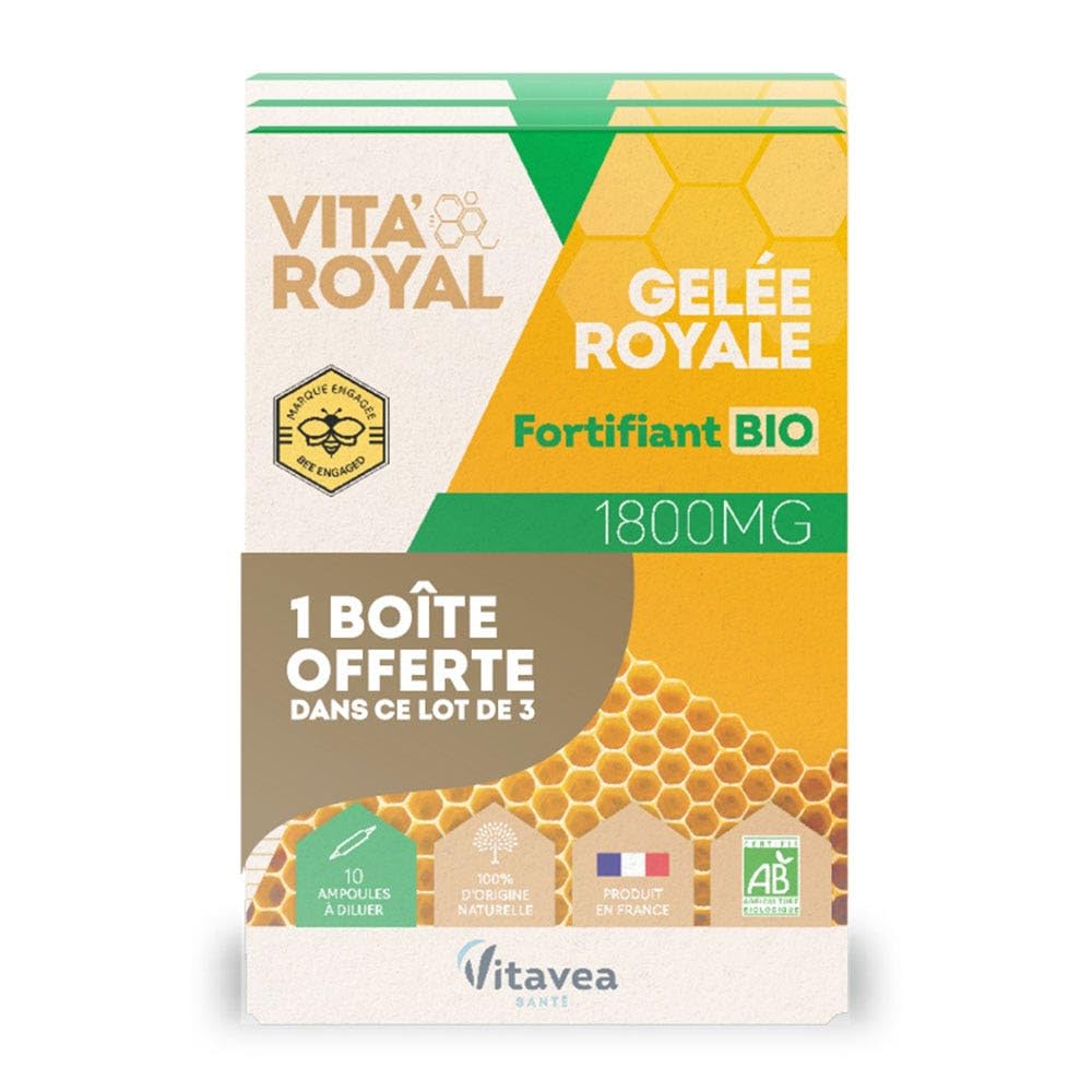 VITA'ROYAL Organic Fortifying Supplement The VITA'ROYAL Organic Fortifying Supplement formula, 100 natural and organic, helps support your body. With a high concentration of 1800 mg, it provides an excellent nutritional concentrate, a source of vitamins, minerals, and amino acids. Royal jelly, a rare and precious ingredient produced by bees, is renowned for its nutritional benefits. Product Details: High concentration: 1800 mg of royal jelly 100 natural organic formula, free of preservatives, colorings, and flavorings Production methods that respect bees and the environment surrounding the hives About Vitavea Vitavea, a specialist in natural wellness, offers a wide range of products to help you take care of yourself. We are committed to supporting you on your wellness journey and helping you find the dietary supplement that meets your needs. Accessible to all and easy to use, our products fit perfectly into your daily life. A true treasure of the hive, royal jelly is at the heart of the Vita'Royal range formulas. By offering 100 natural and organic solutions, Vita'Royal is committed to protecting bees and their environment. Ingredients: Water, agave extract , royal jelly , concentrated orange juice . Ingredients from organic farming Directions for use: Per 1 ampoule: Organic royal jelly: 1800 mg Precautions for use: Do not exceed the recommended daily dose. Consume as part of a varied and balanced diet and a healthy lifestyle. Not suitable for people allergic to bee products. Use is not recommended for people undergoing anti-diabetic treatment. Keep out of reach of children. INGREDIENTS Water, agave extract , royal jelly , concentrated orange juice . Ingredients from organic farming SAFETY WARNING Do not exceed the recommended daily dose. Consume as part of a varied and balanced diet and a healthy lifestyle. Not suitable for people allergic to bee products. Use by people undergoing anti-diabetic treatment is not recommended. Keep out of reach of children. See morePRODUCED IN FRANCE: Vita'Royal Organic Fortifying Royal Jelly food supplement is produced in our laboratories in the Vendée region of France, adhering to best practices. DIRECTIONS: 1 ampoule per day, diluted in a glass of water. Shake the ampoule before use. This pack of 3 contains 30 ampoules for a 30-day course to boost your body and restore daily energy and vitality. NATURAL AND COMPLETE FORMULA: Secreted by worker bees to feed their queen, royal jelly is a true superfood from the hive thanks to its exceptional nutritional richness and its supply of minerals and trace elements. The Vita'Royal Organic Fortifying formula provides 1800 mg of royal jelly in a 100 natural and organic, highly concentrated formula to strengthen the body. HIGH-DOSE NATURAL FORTIFIER: Vita'Royal Organic Fortifying Supplement contains a high dose of royal jelly, with 1800 mg per ampoule, a concentrated source of effectiveness. Royal jelly is a precious and rare ingredient, renowned for its nutritional and fortifying properties, much like propolis and honey, making it ideal during seasonal changes. ROYAL JELLY FOOD SUPPLEMENT: Vita'Royal Organic Fortifying Supplement supports the body and immune system and contains the best active ingredient from the beehive, known for its nutritional properties: Royal Jelly. Its high dose makes it an excellent fortifier to help you stay healthy all year round.Vitavea - Vita'Royal Fortifiant BIO - Fortifiant, Bienfaits Naturels de la Ruche - Gelée royale 1800 mg hautement dosée - Lot de 3-30 ampoules - Fabriqué en FranceDESCRIPTION DU PRODUIT DESCRIPTION DU PRODUIT VITA'ROYAL Fortifiant BIO La formule VITA'ROYAL Fortifiant BIO, 100 naturelle et BIO, aide à soutenir votre organisme. Hautement dosée à 1800 mg elle constitue un excellent concentré nutritif source de vitamines, minéraux et acides aminés. La gelée royale, ingrédient rare et précieux fabriqué par les abeilles, est reconnue pour ses vertus nutritives. Détails du produit : Haute concentration : 1800 mg de gelée royale Formule 100 naturelle BIO, sans conservateurs, colorants, arômes Démarche de production respectueuse des abeilles et de la nature autour des ruches A propos de Vitavea Vitavea, spécialiste du bien-être au naturel, vous propose une large gamme de produits pour prendre soin de vous. Nous avons à cœur de vous accompagner dans votre démarche bien-être et de vous permettre de trouver le complément alimentaire qui répond à vos besoins. Accessibles à tous, faciles d'utilisation, nos produits s'intègrent idéalement dans votre vie quotidienne. Véritable trésor la ruche, la gelée royale est au cœur des formules de la gamme Vita'Royal. En proposant des solutions 100 naturelles et bio, Vita'Royal s'engage pour la protection des abeilles et de leur environnement. Ingrédients : Eau, sorte d'agave , gelée royale , jus d'orange concentré . Ingrédients issus de l'agriculture biologique Conseils d'utilisation : Pour 1 ampoule : Gelée royale BIO : 1800 mg Précautions d'emploi : Ne pas dépasser la dose journalière recommandée. À consommer dans le cadre d'une alimentation variée et équilibrée et d'un mode de vie sain. Ne convient pas aux personnes allergiques aux produits de la ruche. L'emploi chez les personnes sous traitement anti-diabétique est déconseillé. À garder hors de portée des enfants. INGRÉDIENTS Eau, sorte d'agave , gelée royale , jus d'orange concentré . Ingrédients issus de l'agriculture biologique AVERTISSEMENT DE SÉCURITÉ Ne pas dépasser la dose journalière recommandée. À consommer dans le cadre d'une alimentation variée et équilibrée et d'un mode de vie sain. Ne convient pas aux personnes allergiques aux produits de la ruche. L'emploi chez les personnes sous traitement anti-diabétique est déconseillé. À garder hors de portée des enfants. Voir plusPRODUIT EN FRANCE : Le complément alimentaire Vita'Royal Fortifiant BIO à base de Gelée Royale est produit dans nos laboratoires en V