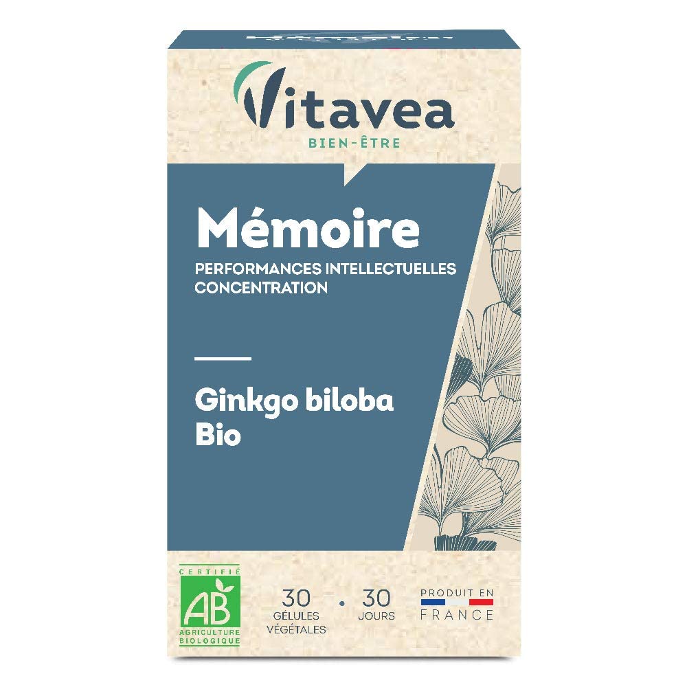 1 capsule provides 200 mg of Ginkgo biloba 1 capsule per day, to swallow with a glass of water. Do not exceed the recommended dose. To be consumed as part of a varied and balanced diet and a healthy lifestyle. Store in a dry, cool place. Keep out of reach of children. Not recommended for pregnant or breastfeeding women. Consult a doctor or pharmacist in case of concomitant use of anticoagulants. Use in people undergoing antidepressant treatment is not recommended. About the Vitavea brand, specialist in natural well-being, offers you a wide range of products to take care of you. We are committed to supporting you in your well-being process and allowing you to find the food supplement that meets your needs. Accessible to all, easy to use, our products fit ideally into your daily life. All our food supplements are made in France and GMP (Good Manufacturing Practices) certified, guaranteeing quality and respect for manufacturing processes. With Vitavea, well-being and health are within reach! INGREDIENTS Ginkgo extract (Ginkgo biloba) acacia gum (Acacia seyal) capsule of plant origin (cellulose derivative) anti-caking agent: talc. Ingredient from organic farming. DIRECTIONS FOR USE 1 capsule per day, to swallow with a glass of water. SAFETY WARNING Do not exceed the recommended dose. To be consumed as part of a varied and balanced diet and a healthy lifestyle. Store in a dry, cool place. Keep out of reach of children. Not recommended for pregnant or breastfeeding women. Consult a doctor or pharmacist in case of concomitant use of anticoagulants. Use in people undergoing antidepressant treatment is not recommended. FRENCH MANUFACTURE: The Vitavea vitality memory food supplement based on organic ginkgo biloba is made in France and certified GMP (Good Manufacturing Practices), guaranteeing you quality and compliance with manufacturing processes. Organic product. USE: The dosage of the Vitavea memory food supplement based on ginkgo biloba is 1 capsule per day, to be swallowed with a glass of water. One capsule contains 200 mg of organic ginkgo biloba. This pack contains 30 capsules, i.e. a 1-month course. ORGANIC GINKGO BILOBA: Ginkgo biloba, also known as the "thousand crowns tree", is native to Asia. It can live for more than 1,000 years and has existed for more than 300 million years. The ginkgo biloba contained in the Vitavea memory food supplement contributes to good blood circulation, promotes good memory and concentration, and stimulates cognitive functions. CONCENTRATION AND MEMORY: The 100 natural and organic formula of the Vitavea memory food supplement contains organic ginkgo biloba, acclaimed for promoting intellectual performance and stimulating cognitive functions. MEMORY FOOD SUPPLEMENT: The Vitavea memory food supplement is your ally to support your intellectual performance and concentration. Its formula contains organic ginkgo biloba, a star active ingredient for intellectual performance, recognized and acclaimed. 1 gélule apporte 200 mg de Ginkgo biloba 1 gélule par jour, à avaler avec un verre d'eau. Ne pas dépasser la dose recommandée. À consommer dans le cadre d'une alimentation variée et équilibrée et d'un mode de vie sain. À conserver dans un endroit sec et frais. Garder hors de portée des enfants. Déconseillé chez la femme enceinte ou allaitante. Consulter un médecin ou un pharmacien en cas d'usage concomitant d'anticoagulants. L'emploi chez les personnes en traitement antidépresseur est déconseillé. A propos de la marque Vitavea, spécialiste du bien-être au naturel, vous propose une large gamme de produits pour prendre soin de vous. Nous avons à cœur de vous accompagner dans votre démarche bien-être et de vous permettre de trouver le complément alimentaire qui répond à vos besoins. Accessibles à tous, faciles d'utilisation, nos produits s'intègrent idéalement dans votre vie quotidienne. Tous nos compléments alimentaires sont fabriqués en France et certifiés BPF (Bonnes Pratiques de Fabrication), vous garantissant qualité et respect des processus de fabrication. Avec Vitavea, le bien-être et la santé sont à portée de main ! INGRÉDIENTS Extrait de ginkgo ( Ginkgo biloba ) gomme d'acacia ( Acacia seyal ) gélule d'origine végétale (dérivé de cellulose) anti-agglomérant : talc. Ingrédient issu de l'agriculture biologique. MODE D'EMPLOI 1 gélule par jour, à avaler avec un verre d'eau. AVERTISSEMENT DE SÛRETÉ Ne pas dépasser la dose recommandée. À consommer dans le cadre d'une alimentation variée et équilibrée et d'un mode de vie sain. À conserver dans un endroit sec et frais. Garder hors de portée des enfants. Déconseillé chez la femme enceinte ou allaitante. Consulter un médecin ou un pharmacien en cas d'usage concomitant d'anticoagulants. L'emploi chez les personnes en traitement antidépresseur est déconseillé. FABRICATION FRANCAISE : Le complément alimentaire mémoire vitalité Vitavea à base de ginkgo biloba BIO est fabriqué en France et certifié BPF (Bonnes Pratiques de Fabrication), vous garantissant qualité et respect des processus de fabrication. Produit Biologique. UTILISATION : La posologie du complément alimentaire mémoire Vitavea à base de ginkgo biloba est de 1 gélule par jour, à avaler avec un verre d'eau. Une gélule contient 200 mg de ginkgo biloba BIO. Ce pack contient 30 gélules soit une cure de 1 mois. GINKGO BILOBA BIO : Le ginkgo biloba, également appelé « arbre aux mille écus » est originaire d'Asie, il peut vivre plus de 1 000 ans et existe depuis plus de 300 millions d'années. Le ginkgo biloba contenu dans le complément alimentaire mémoire Vitavea contribue à une bonne circulation sanguine, favorise une bonne mémoire et concentration et stimule les fonctions cognitives. CONCENTRATION ET MEMOIRE : La formule 100 naturelle et BIO du complément alimentaire mémoire Vitavea contient du ginkgo biloba bio plébiscité pour favoriser les performances intellectuelles et stimule