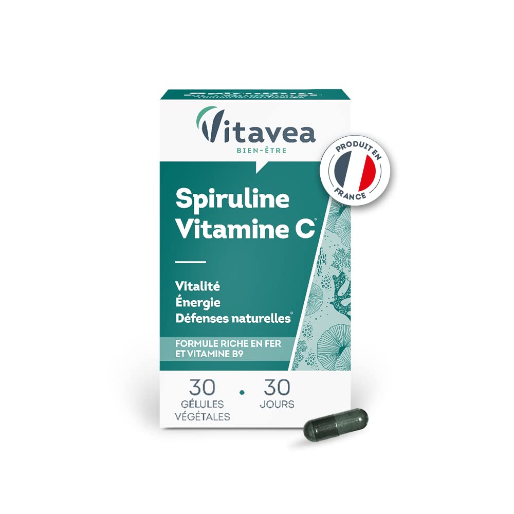 INGREDIENTS Spirulina plant-based capsule (cellulose derivative) vitamin C mineral: iron pyrophosphate anti-caking agent: magnesium salts of fatty acids vitamin B9.FRENCH MANUFACTURE: This Vitavea vitality food supplement spirulina, vitamin C, iron and vitamin B9 is made in France and certified GMP (Good Manufacturing Practices), guaranteeing you quality and compliance with manufacturing processes. Suitable for a vegetarian and vegan diet. USE: The dosage of this Vitavea vitality and energy food supplement based on spirulina, vitamin C, iron and vitamin B9 is 1 capsule per day to be taken with a glass of water. Pack of 30 capsules, i.e. a 30-day course. SPIRULINA, VITAMINS, IRON - THE WINNING TRIO: The Vitavea energy and vitality food supplement is composed of spirulina, a microalgae rich in protein, often called a "super-nutrient". Vitamin C, iron and vitamin B9 (folic acid) help support natural defenses and contribute to reducing fatigue and maintaining the body's vitality. 1 capsule will bring you all the benefits of its innovative and essential formula during the change of seasons or at the arrival of winter. FIND VITALITY AND ENERGY: Thanks to its formula rich in Iron and vitamin B9 (folic acid), this Vitavea energy food supplement helps reduce daily fatigue, maintain the body's vitality and support natural defenses. 1 capsule provides you with 100 of the NRV (Nutritional Reference Value) in vitamin B9. Spirulina and vitamin C complete the formula. This food supplement is your ally to boost your body and your natural defenses. ENERGY FOOD SUPPLEMENT: This vitality well-being food supplement contains recognized and acclaimed active ingredients to contribute to the normal functioning of the immune system and reduce fatigue. It combines spirulina, vitamin C, iron and vitamin B9 (folic acid). Its formula rich in iron and vitamin B9 makes it the ideal ally to regain tone and vitality. INGRÉDIENTS Spiruline gélule d'origine végétale (dérivé de cellulose) vitamine C minéral : pyrophosphate de fer anti-agglomérant : sels de magnésium d'acide gras vitamine B9.FABRICATION FRANCAISE : Ce complément alimentaire vitalité Vitavea spiruline, vitamine C, fer et vitamine b9 est fabriqué en France et certifié BPF (Bonnes Pratiques de Fabrication), vous garantissant qualité et respect des processus de fabrication Adapté à un régime végétarien et végan. UTILISATION : La posologie de ce complément alimentaire vitalité et énergie Vitavea à base de spiruline, vitamine C, fer et vitamine b9 est de 1 gélule par jour à prendre avec un verre d'eau Pack de 30 gélules soit une cure de 30 jours. SPIRULINE, VITAMINES, FER - LE TRIO GAGNANT : Le complément alimentaire énergie et vitalité Vitavea est composé de spiruline, microalgue riche en protéines, souvent appelé « super-nutriment » La vitamine C, le fer et la vitamine B9 (acide folique) permettent de soutenir les défenses naturelles et contrinuent à réduire la fatigue et à maintenir la vitalité de l'organisme 1 gélule vous apportera tous les bienfaits de sa formule innovante et incontournable lors des changements de saison ou à l'arrivée de l'hiver. RETROUVEZ VITALITE ET ENERGIE : Grâce à sa formule riche en Fer et en vitamine B9 (acide folique), ce complément alimentaire énergie Vitavea contribue à réduire la fatigue au quotidien, à maintenir la vitalité de l'organisme et à soutenir les défenses naturelles 1 gélule vous apporte 100 des VNR (Valeur Nutritionnelle de Référence) en vitamine B9 La spiruline et la vitamine C complètent la formule Ce complément alimentaire est votre allié pour booster votre organisme et vos défenses naturelles. COMPLEMENT ALIMENTAIRE ENERGIE : Ce complément alimentaire bien-être vitalité contient des actifs reconnus et plébiscités pour contribuer au fonctionnement normal du système immunitaire et réduire la fatigue Il combine de la spiruline, de la vitamine C, du fer et de la vitamine B9 (acide folique) Sa formule riche en fer et vitamine B9 en fait l'allié idéal pour retrouver tonus et vitalité.